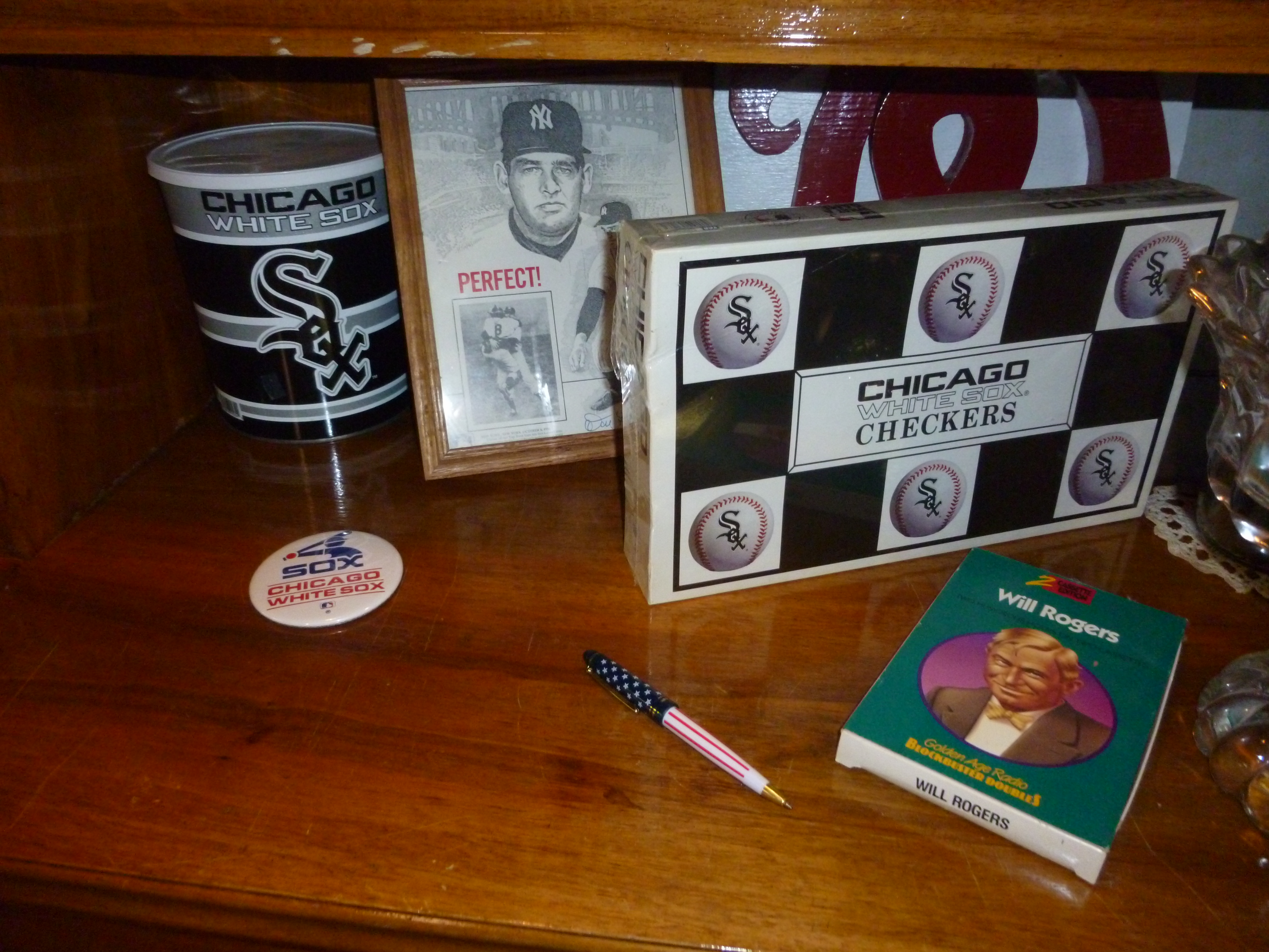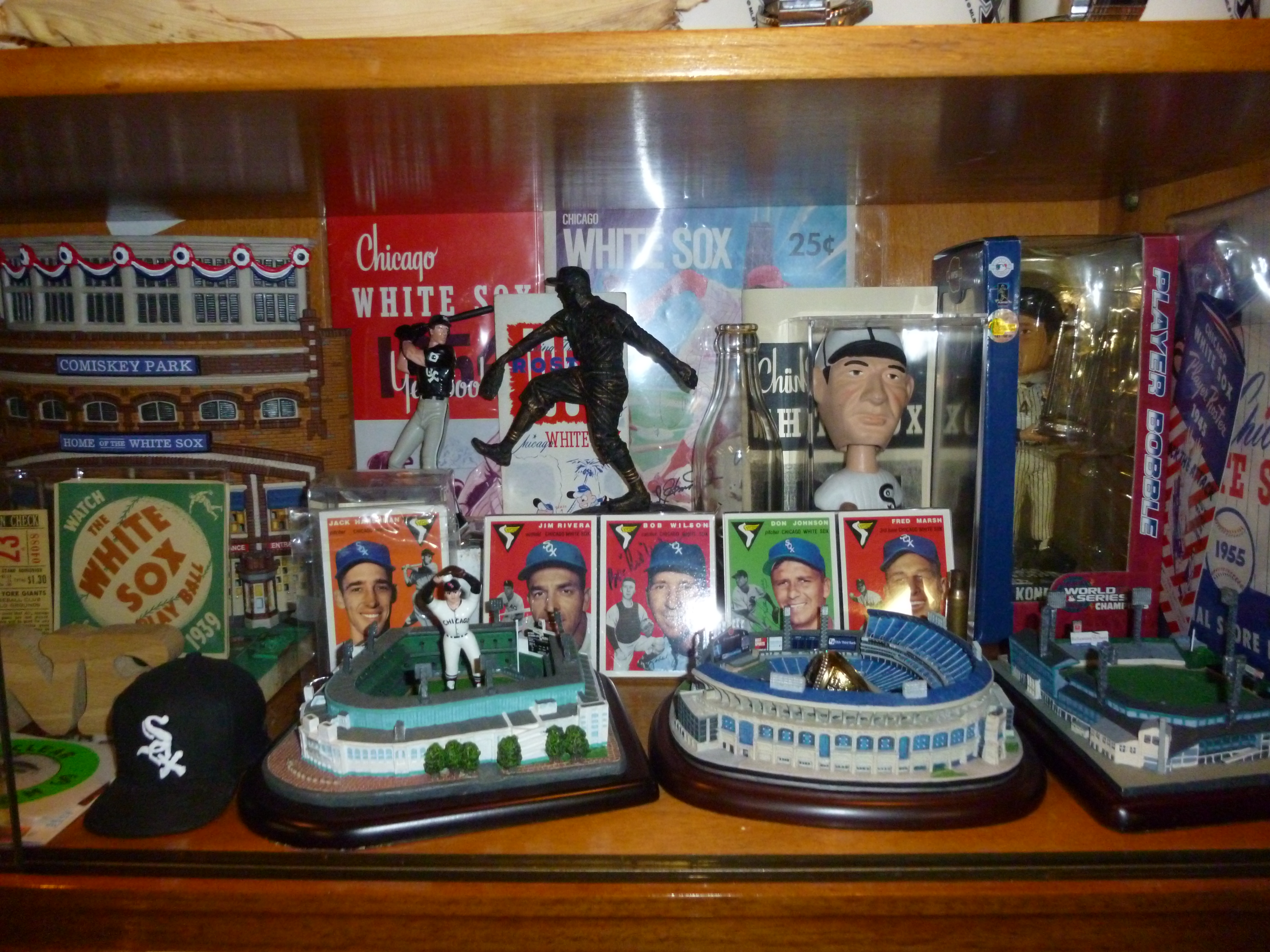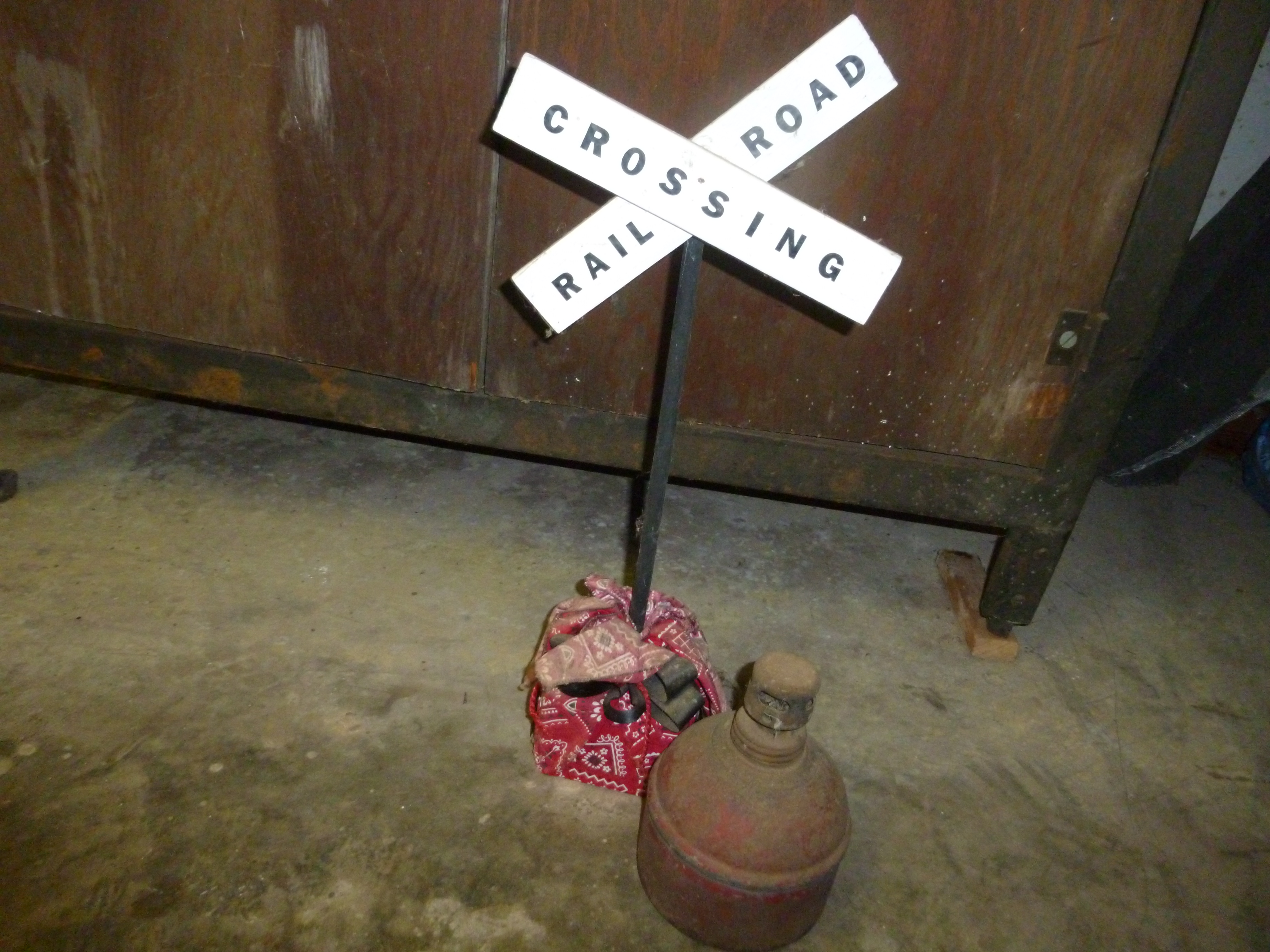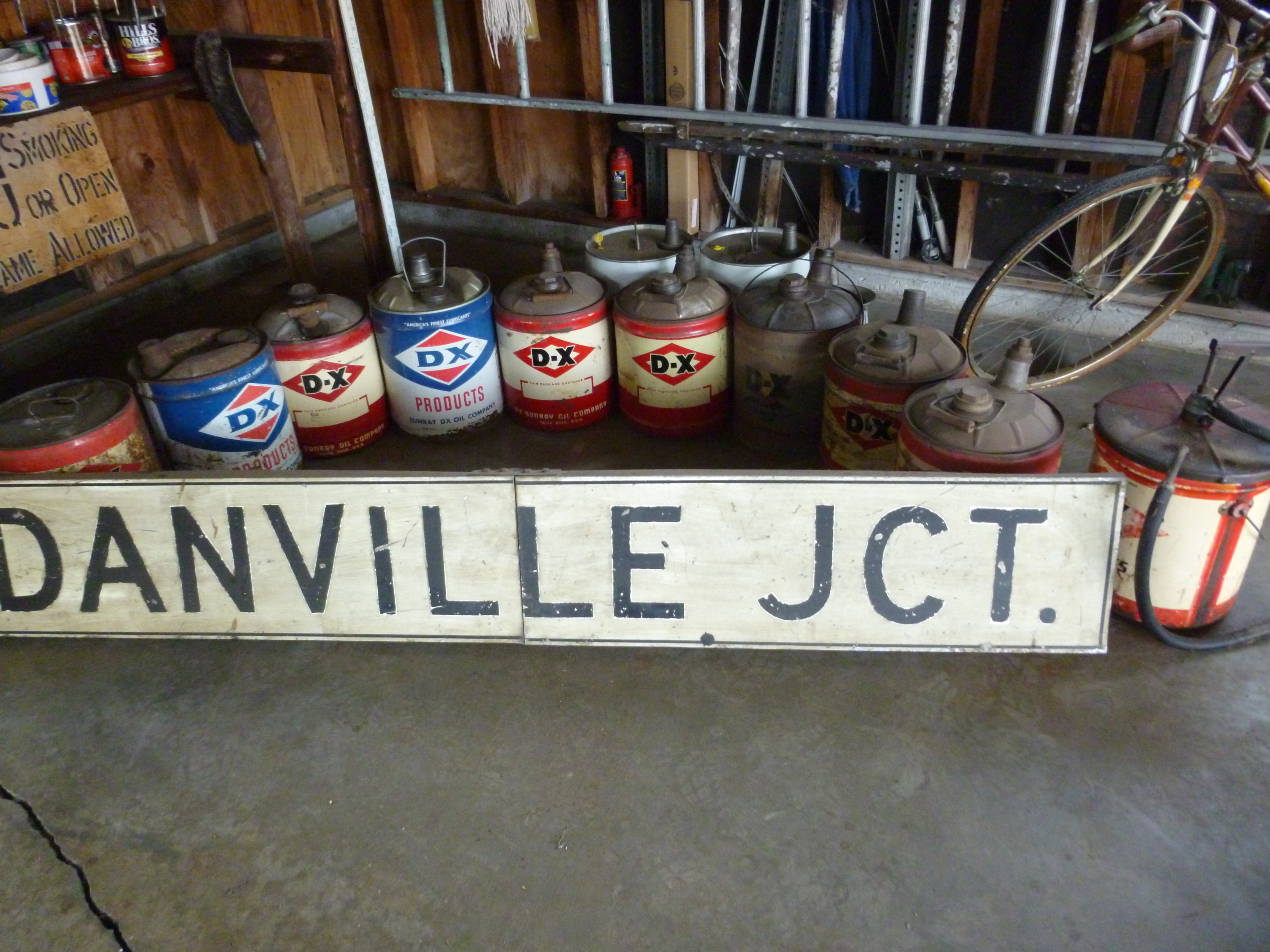 Danville Junction sign; old metal mile markers;  Northfork & Western digging signs; RR signs; early RR locks  – 1950’s; later RR locks; N & W RR car seals – 1950’s; metal RR lantern;  Barber,  Justrite,  Starlite; plastic RR battery lanterns – orange &  yellow Norfork & Southern; Virginia RR  amber color lantern; RR Terre Haute bricks;  Nickle Plate ball peen hammer;  NP shovel; NP scoop;  Cat Eye track sign; RR Derail switch; 1940 Nickle Plate RR ledger – Cayuga – Veedersburg;  RR records   from Chicago – Attica ; T144203 white signal light; train order box; telegraph key; mile post marker Tilton, Illinois; round red sign marker; boxes of RR paper letter heads; RR rule books; RR water cans;  time tables;  New York lantern; So Pacific oiler;  EI & I RR galvanized bucket; N& W RR bucket with spout; 2 caboose lights from Wabash RR;  4’ x 8’ train track board; O gage track and engine & cars; Athear miniature train and accessories; 2 train transformers; covered wagon engines, work engines;  DX motor oil sign; 3 DX original gas pump globes; DX Ethyl gas pump; Diamond DX gas pump 20 cents a gallon; DX road map holder; DX gas cans; Standard 5 gal. cans; Texaco; 3 Wareco window cleaning stations;  Phillips Repo Ethyl 1989 gas pump globe;  Master Manufactured glass oil jar;   Golden Rod oil can; Select 100 matic coin table record selector; small metal basket Hall of Fame signed baseballs including:  Ted Williams, Brook Robinson, Bob Feller, Duke Snider, Yogi Berra, Willie Mays;  collection of 8” pennants from 1942 -26; Pete Rose signed balls;  autographed Major League baseball bats; White Sox statues; 2001 signed scorecard; 1939 World Series  schedule with 1957 ticket stub; part of seat from Comiskey Park; Chicago White Sox bench with retired numbers; lighted score stat box; ball bat collection; Chicago White Sox pants and shirt dated 1953;  North Vermillion state champs autographed photo; Prohibition White Sox juice bottle.