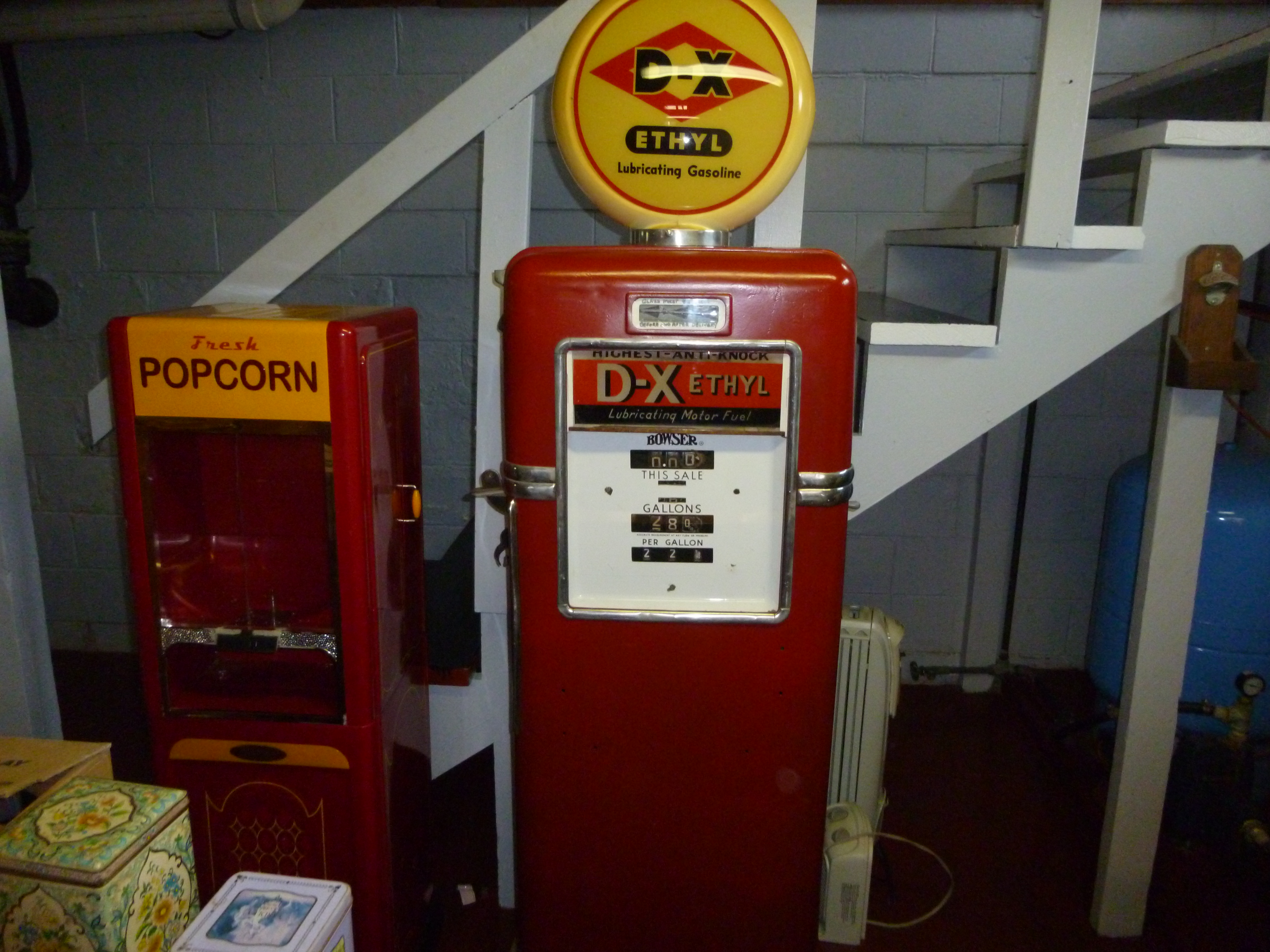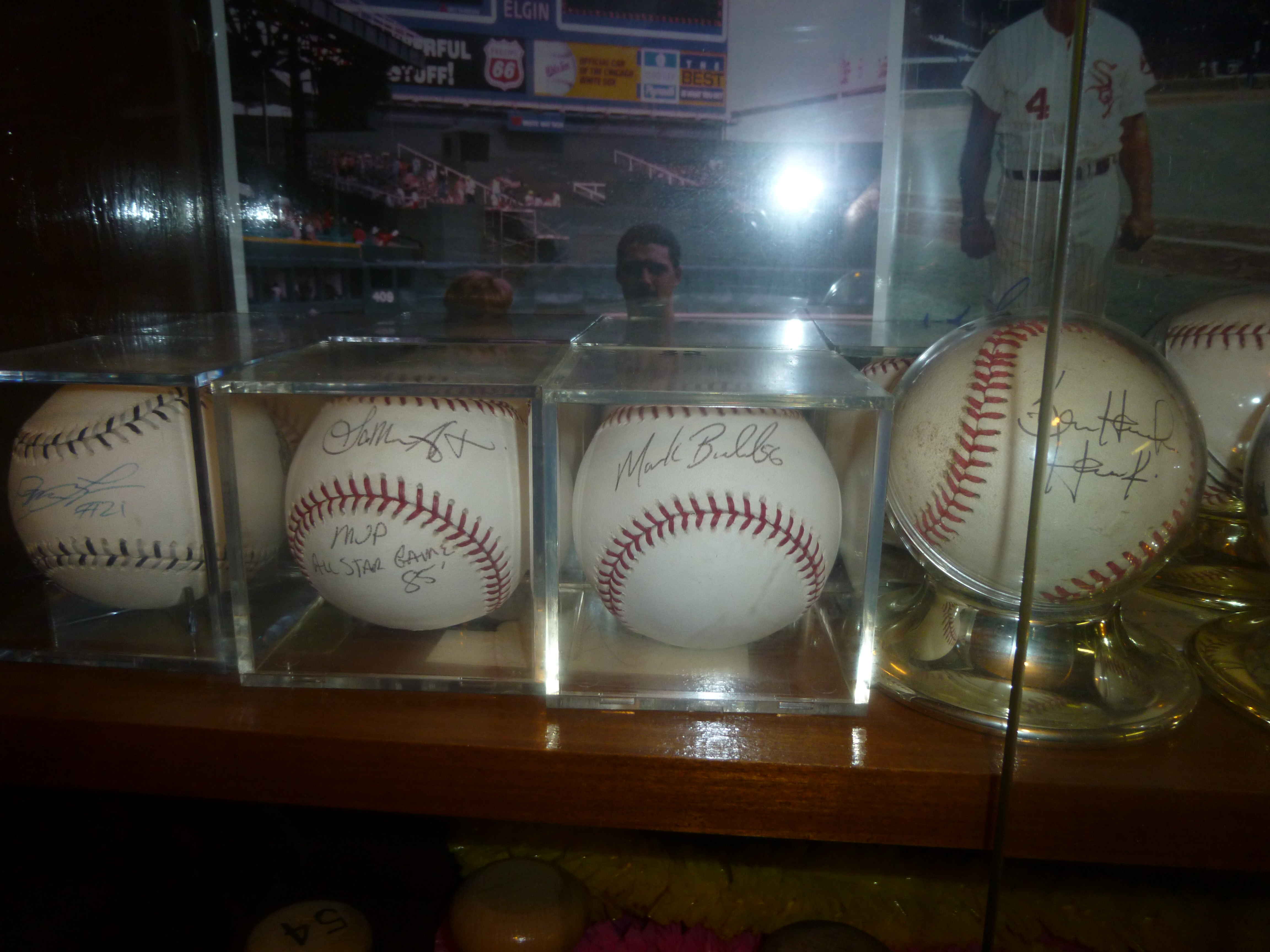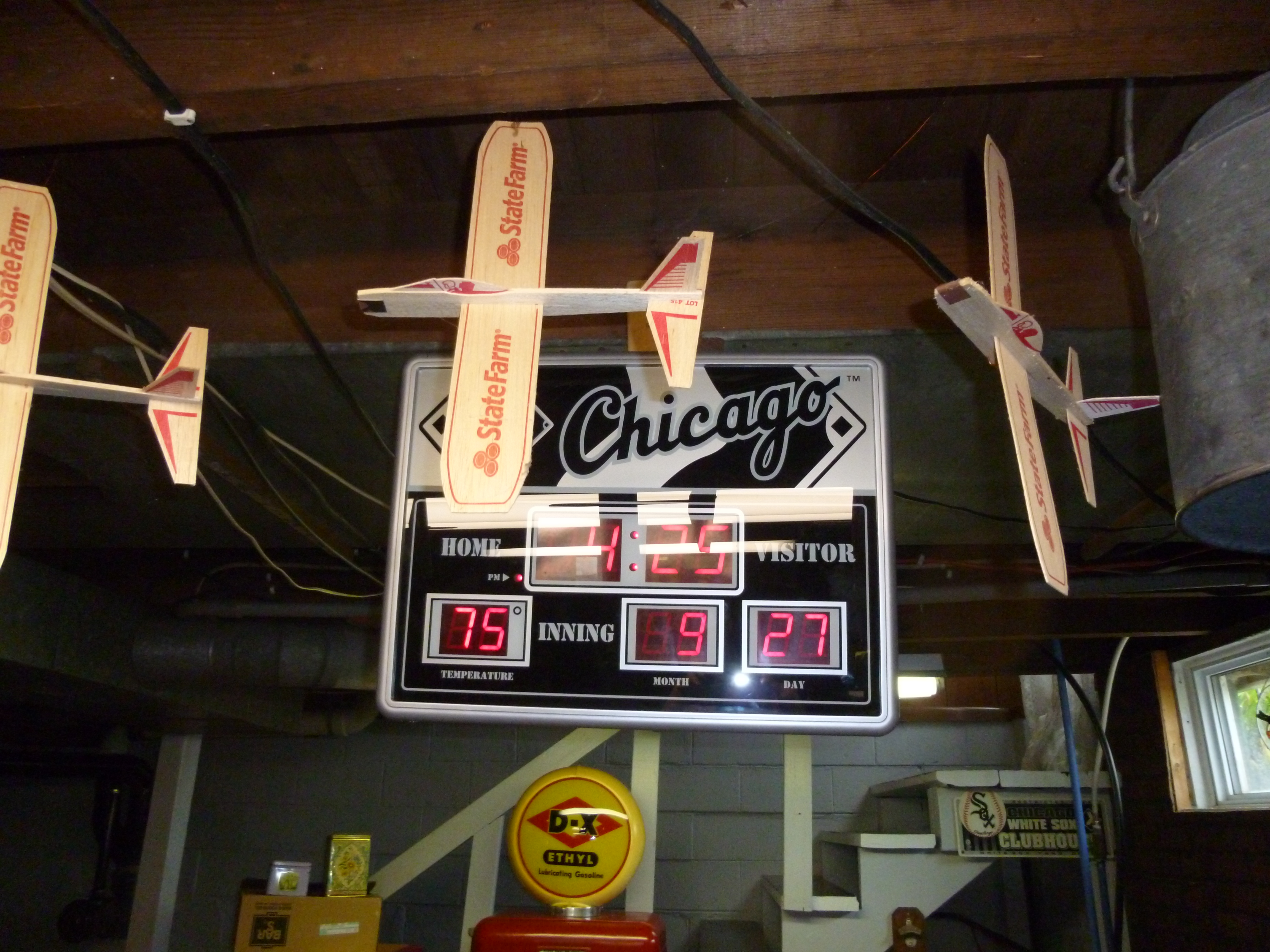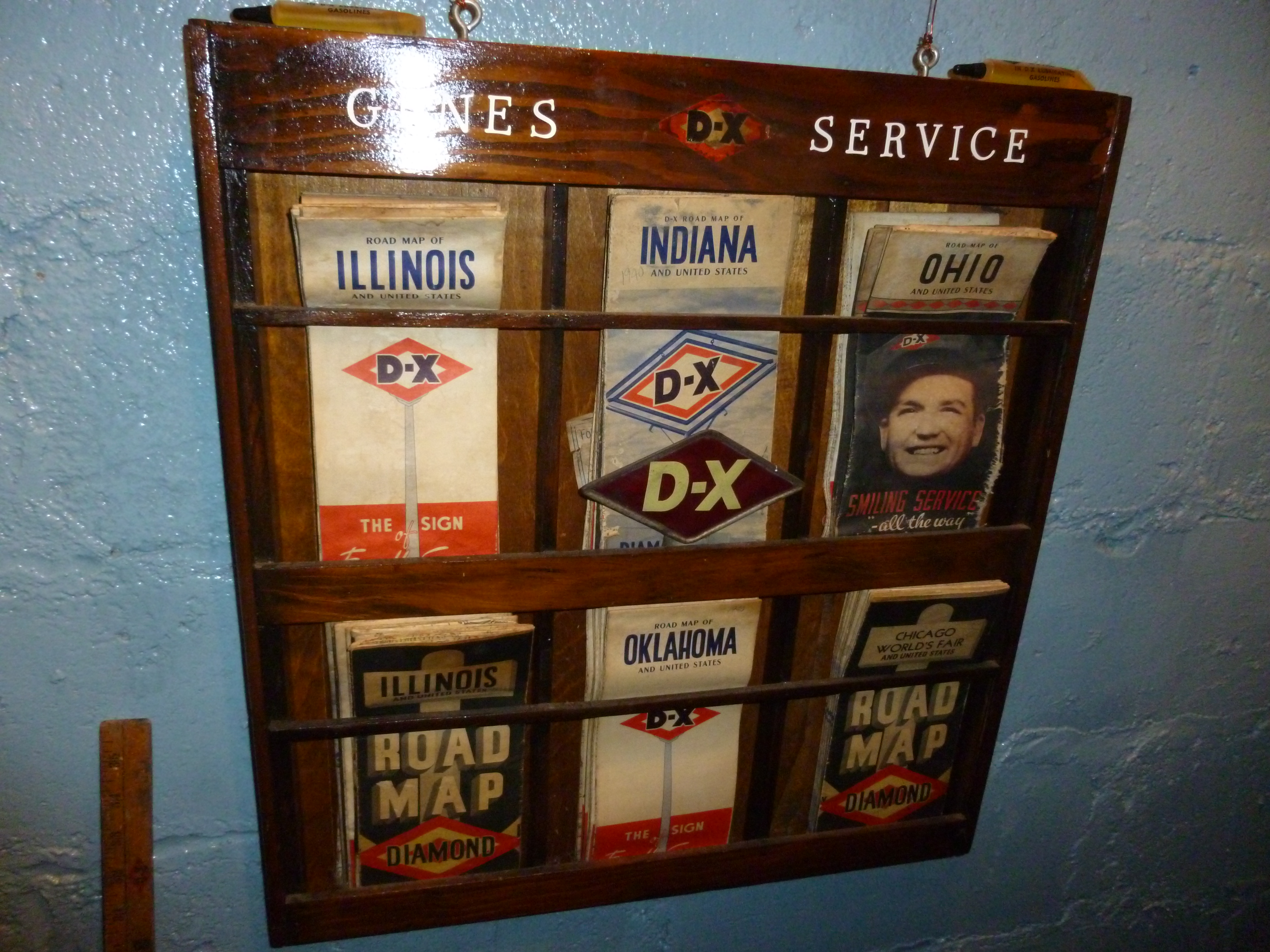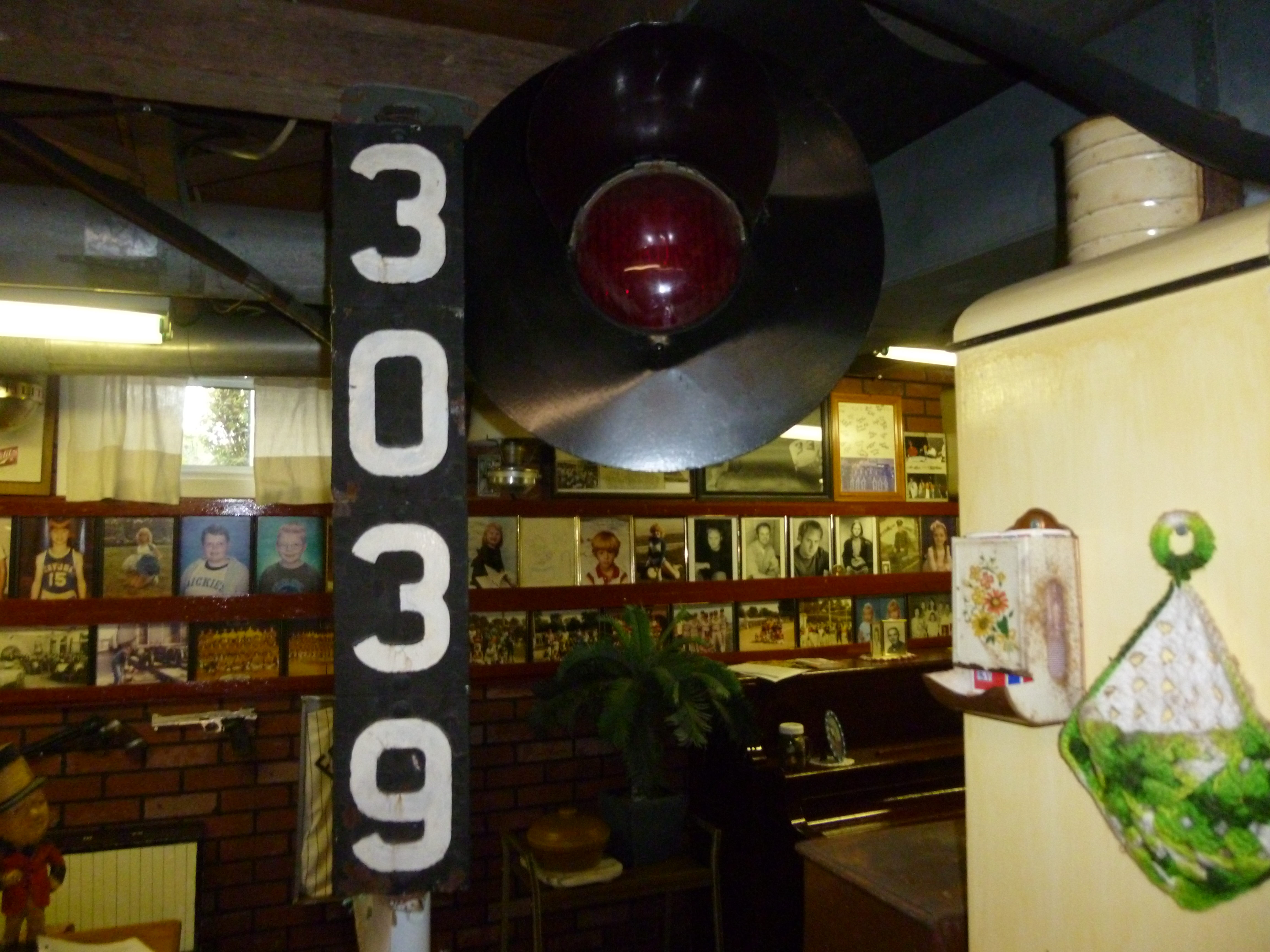 Danville Junction sign; old metal mile markers;  Northfork & Western digging signs; RR signs; early RR locks  – 1950’s; later RR locks; N & W RR car seals – 1950’s; metal RR lantern;  Barber,  Justrite,  Starlite; plastic RR battery lanterns – orange &  yellow Norfork & Southern; Virginia RR  amber color lantern; RR Terre Haute bricks;  Nickle Plate ball peen hammer;  NP shovel; NP scoop;  Cat Eye track sign; RR Derail switch; 1940 Nickle Plate RR ledger – Cayuga – Veedersburg;  RR records   from Chicago – Attica ; T144203 white signal light; train order box; telegraph key; mile post marker Tilton, Illinois; round red sign marker; boxes of RR paper letter heads; RR rule books; RR water cans;  time tables;  New York lantern; So Pacific oiler;  EI & I RR galvanized bucket; N& W RR bucket with spout; 2 caboose lights from Wabash RR;  4’ x 8’ train track board; O gage track and engine & cars; Athear miniature train and accessories; 2 train transformers; covered wagon engines, work engines;  DX motor oil sign; 3 DX original gas pump globes; DX Ethyl gas pump; Diamond DX gas pump 20 cents a gallon; DX road map holder; DX gas cans; Standard 5 gal. cans; Texaco; 3 Wareco window cleaning stations;  Phillips Repo Ethyl 1989 gas pump globe;  Master Manufactured glass oil jar;   Golden Rod oil can; Select 100 matic coin table record selector; small metal basket Hall of Fame signed baseballs including:  Ted Williams, Brook Robinson, Bob Feller, Duke Snider, Yogi Berra, Willie Mays;  collection of 8” pennants from 1942 -26; Pete Rose signed balls;  autographed Major League baseball bats; White Sox statues; 2001 signed scorecard; 1939 World Series  schedule with 1957 ticket stub; part of seat from Comiskey Park; Chicago White Sox bench with retired numbers; lighted score stat box; ball bat collection; Chicago White Sox pants and shirt dated 1953;  North Vermillion state champs autographed photo; Prohibition White Sox juice bottle.