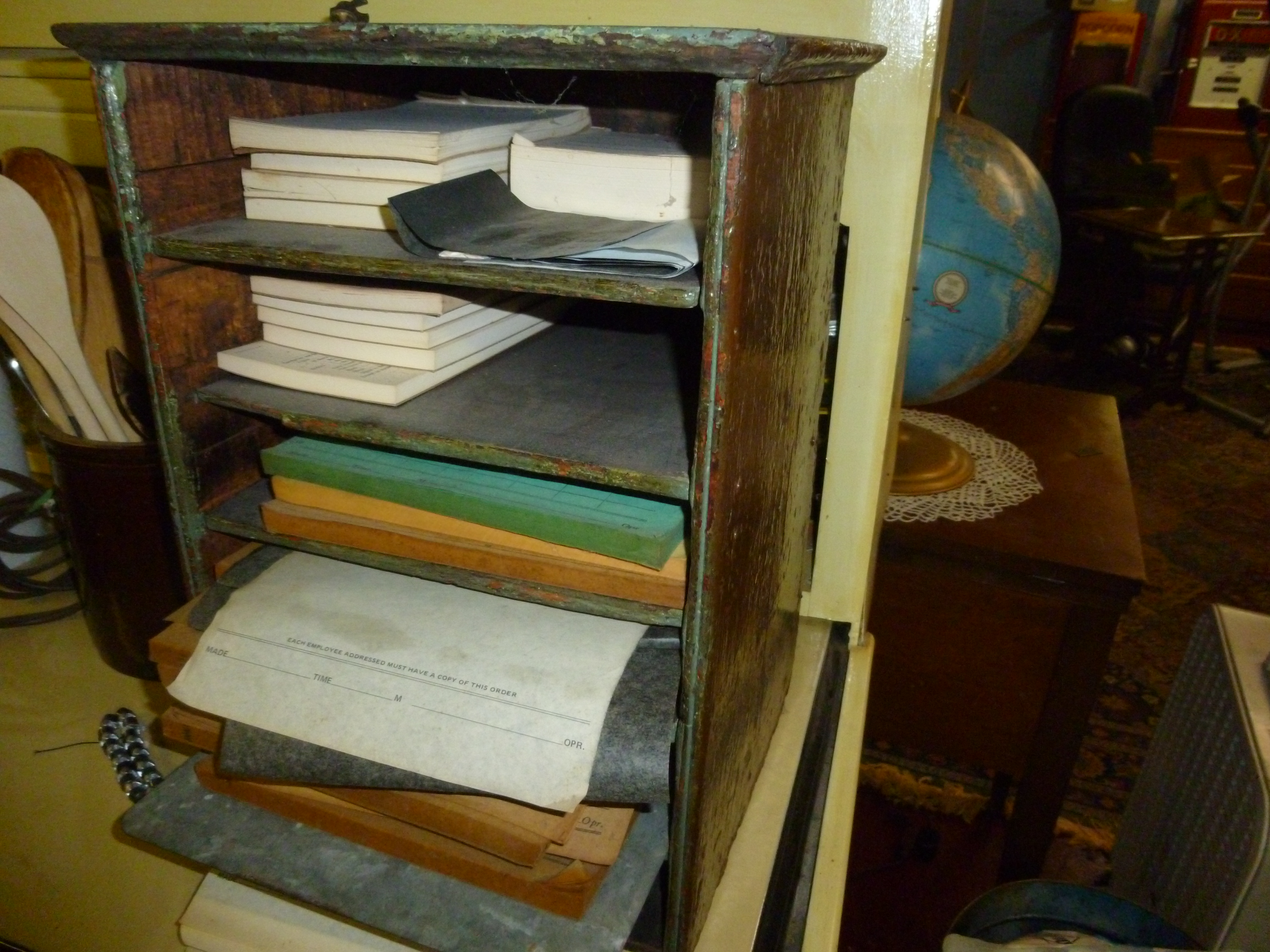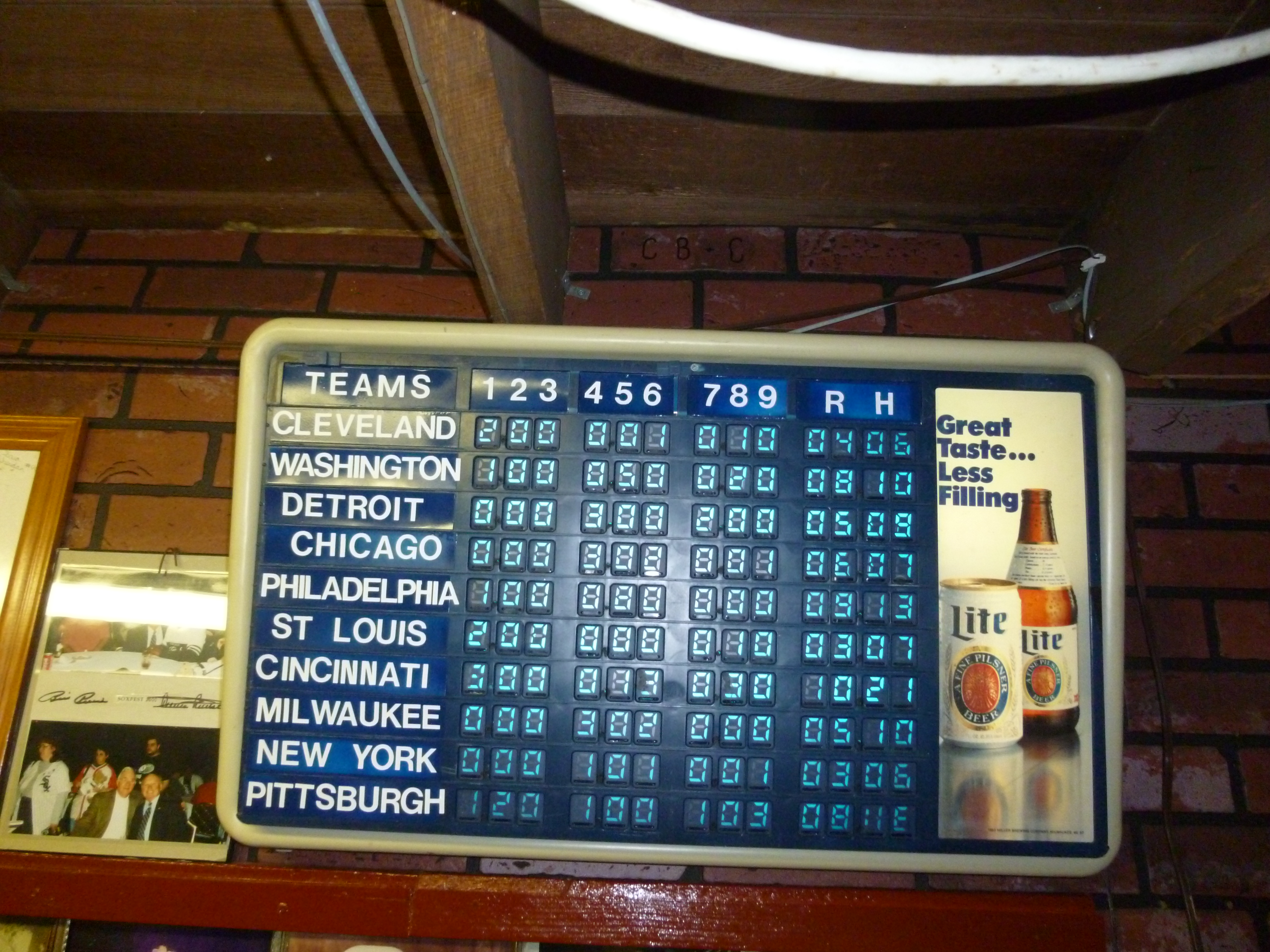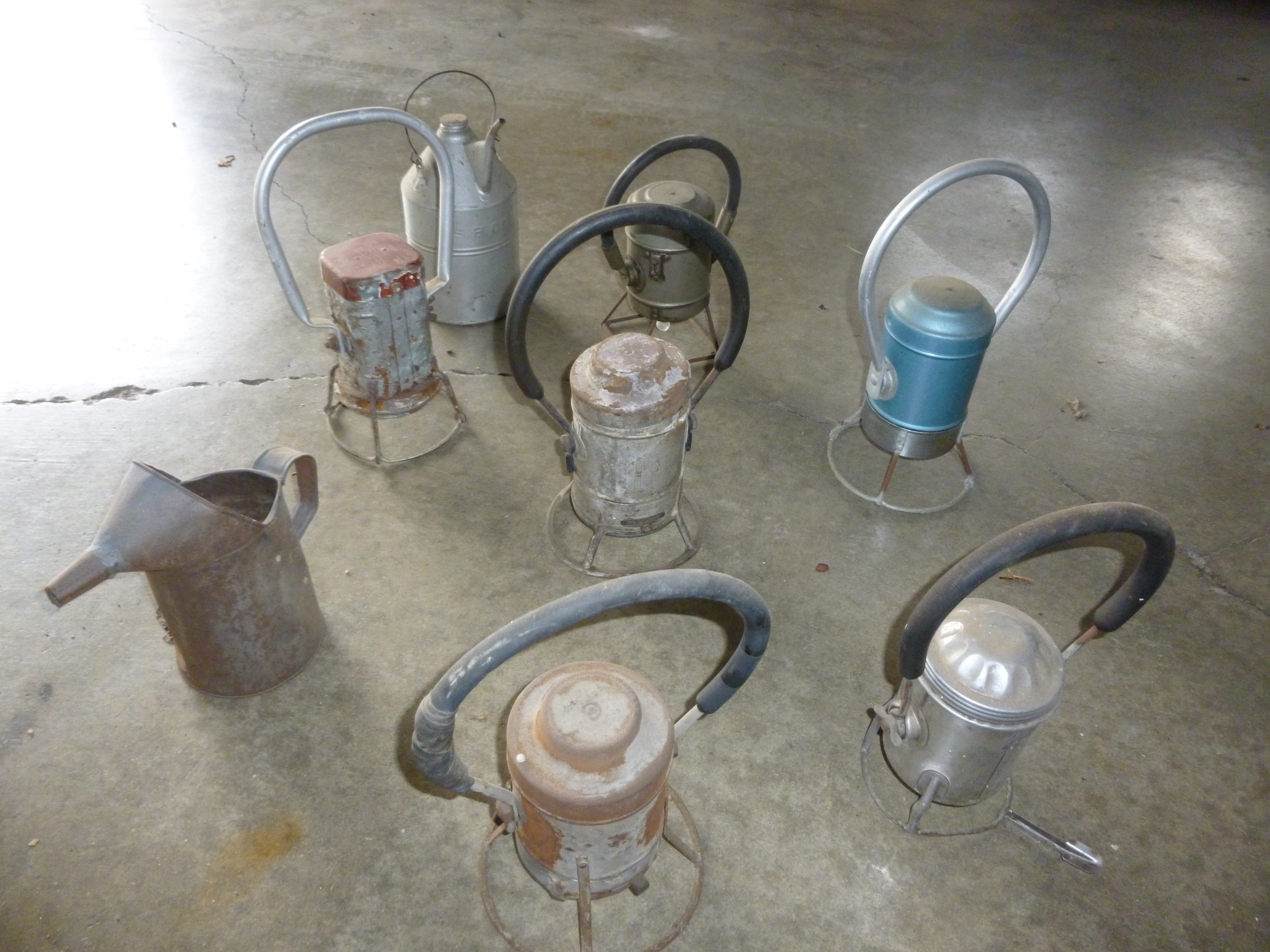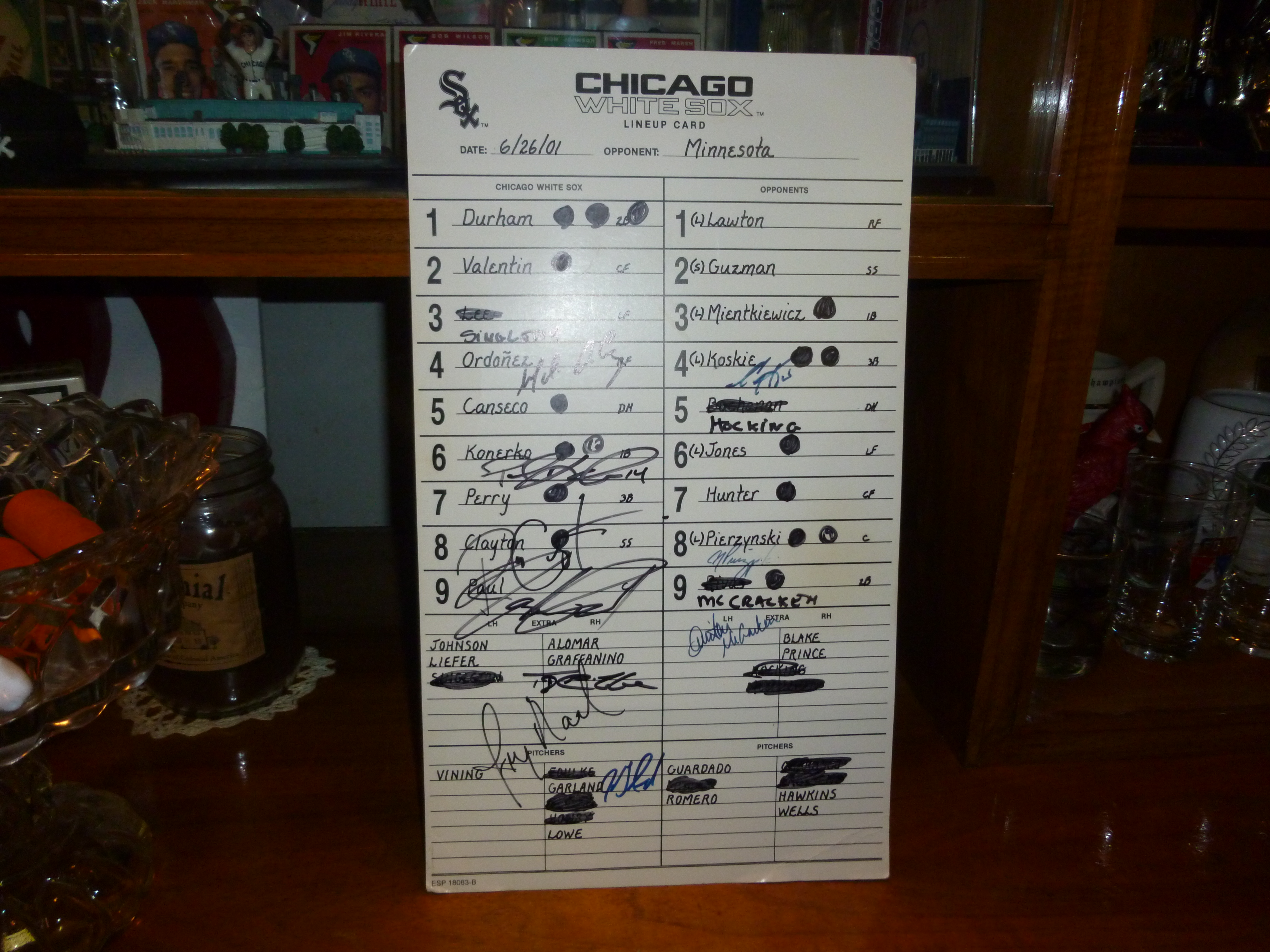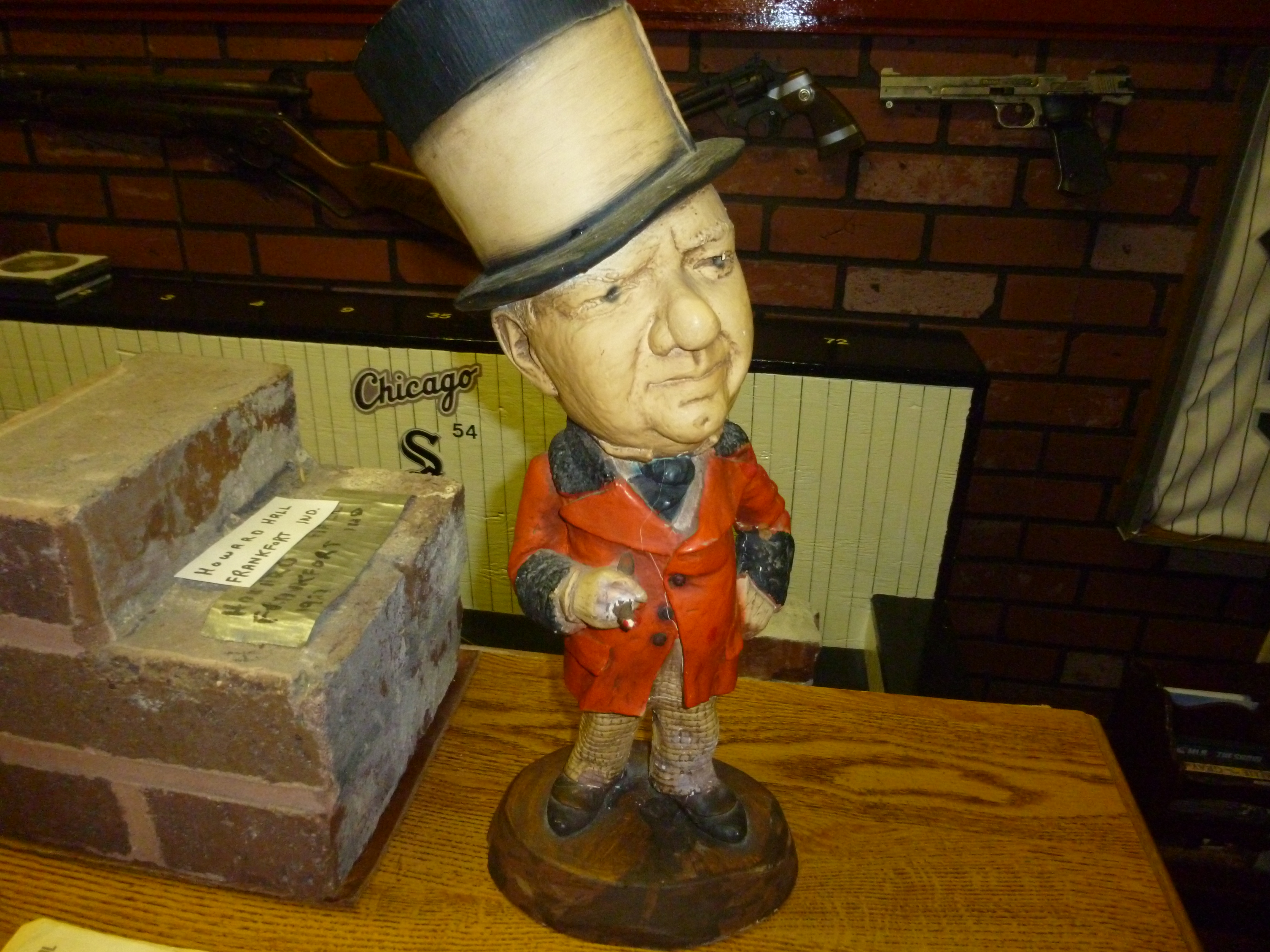 Danville Junction sign; old metal mile markers;  Northfork & Western digging signs; RR signs; early RR locks  – 1950’s; later RR locks; N & W RR car seals – 1950’s; metal RR lantern;  Barber,  Justrite,  Starlite; plastic RR battery lanterns – orange &  yellow Norfork & Southern; Virginia RR  amber color lantern; RR Terre Haute bricks;  Nickle Plate ball peen hammer;  NP shovel; NP scoop;  Cat Eye track sign; RR Derail switch; 1940 Nickle Plate RR ledger – Cayuga – Veedersburg;  RR records   from Chicago – Attica ; T144203 white signal light; train order box; telegraph key; mile post marker Tilton, Illinois; round red sign marker; boxes of RR paper letter heads; RR rule books; RR water cans;  time tables;  New York lantern; So Pacific oiler;  EI & I RR galvanized bucket; N& W RR bucket with spout; 2 caboose lights from Wabash RR;  4’ x 8’ train track board; O gage track and engine & cars; Athear miniature train and accessories; 2 train transformers; covered wagon engines, work engines;  DX motor oil sign; 3 DX original gas pump globes; DX Ethyl gas pump; Diamond DX gas pump 20 cents a gallon; DX road map holder; DX gas cans; Standard 5 gal. cans; Texaco; 3 Wareco window cleaning stations;  Phillips Repo Ethyl 1989 gas pump globe;  Master Manufactured glass oil jar;   Golden Rod oil can; Select 100 matic coin table record selector; small metal basket Hall of Fame signed baseballs including:  Ted Williams, Brook Robinson, Bob Feller, Duke Snider, Yogi Berra, Willie Mays;  collection of 8” pennants from 1942 -26; Pete Rose signed balls;  autographed Major League baseball bats; White Sox statues; 2001 signed scorecard; 1939 World Series  schedule with 1957 ticket stub; part of seat from Comiskey Park; Chicago White Sox bench with retired numbers; lighted score stat box; ball bat collection; Chicago White Sox pants and shirt dated 1953;  North Vermillion state champs autographed photo; Prohibition White Sox juice bottle.