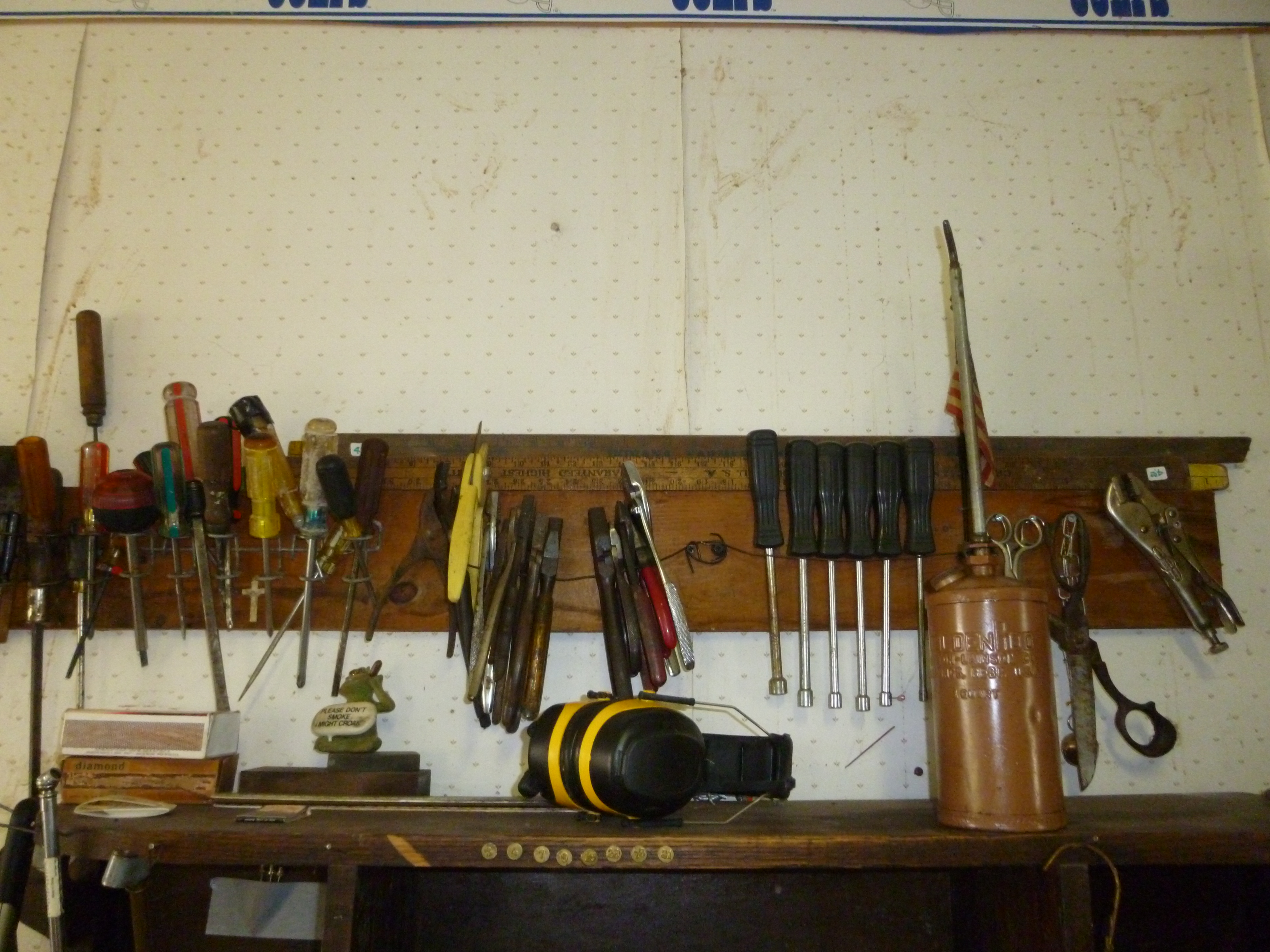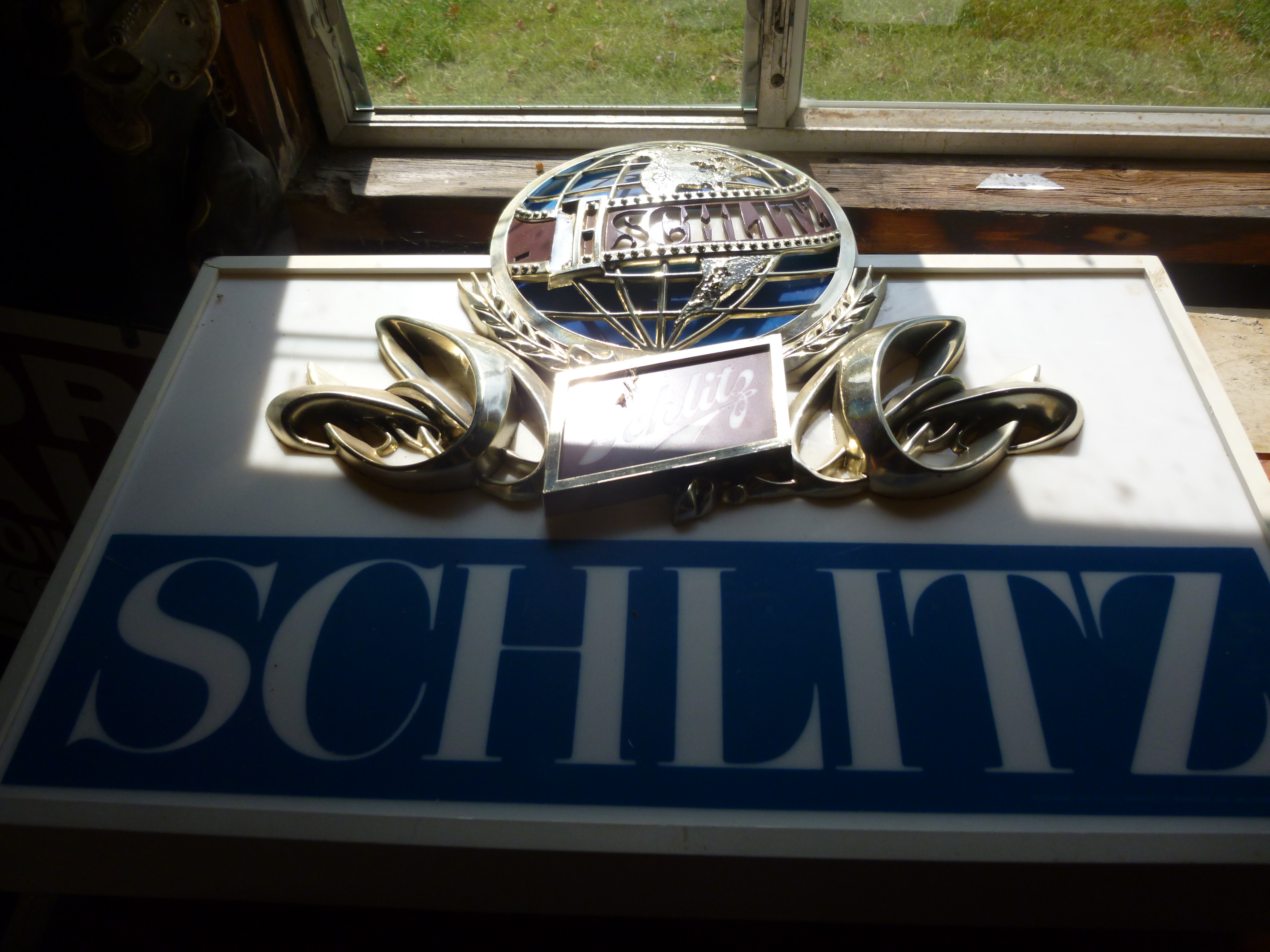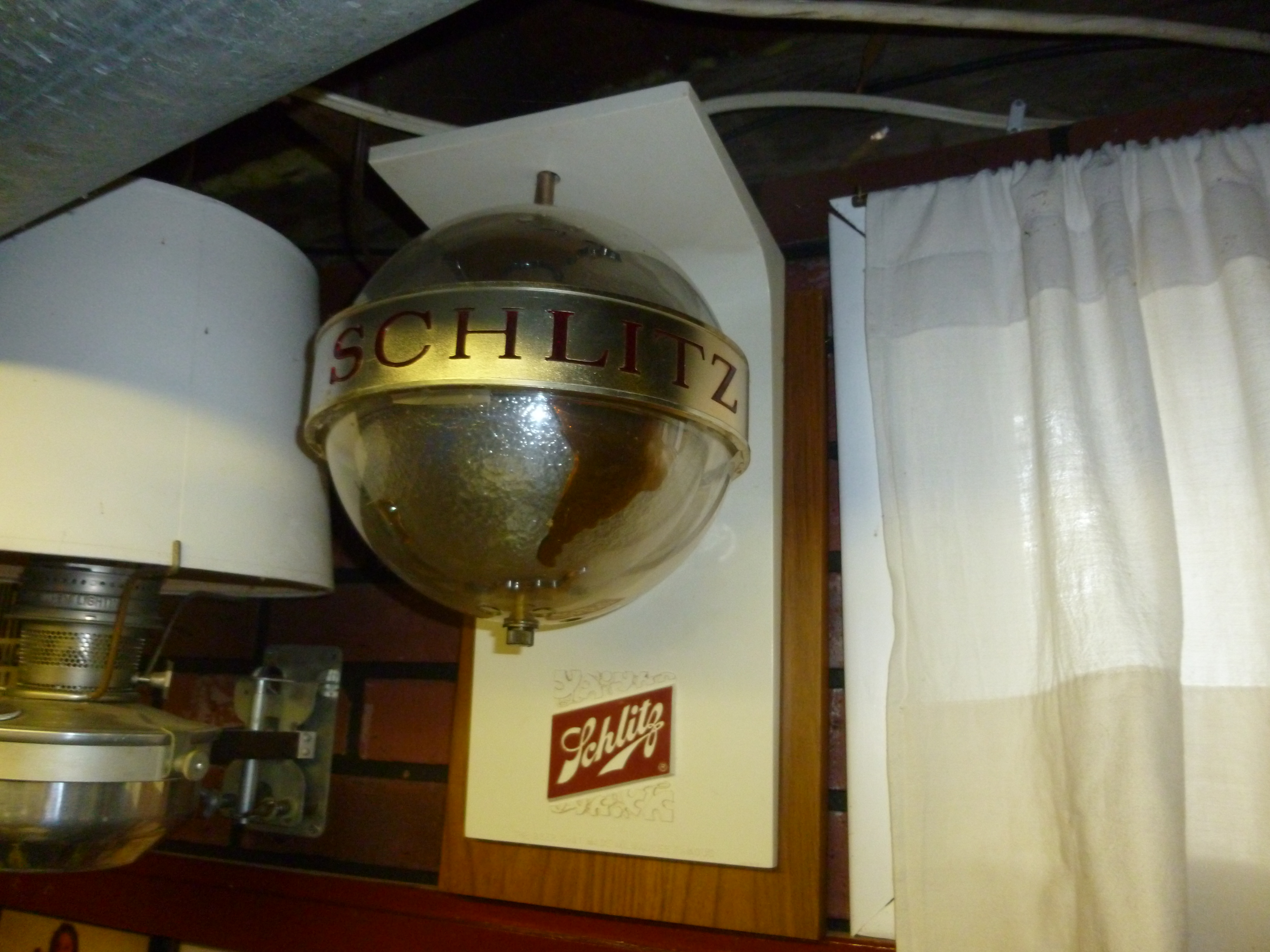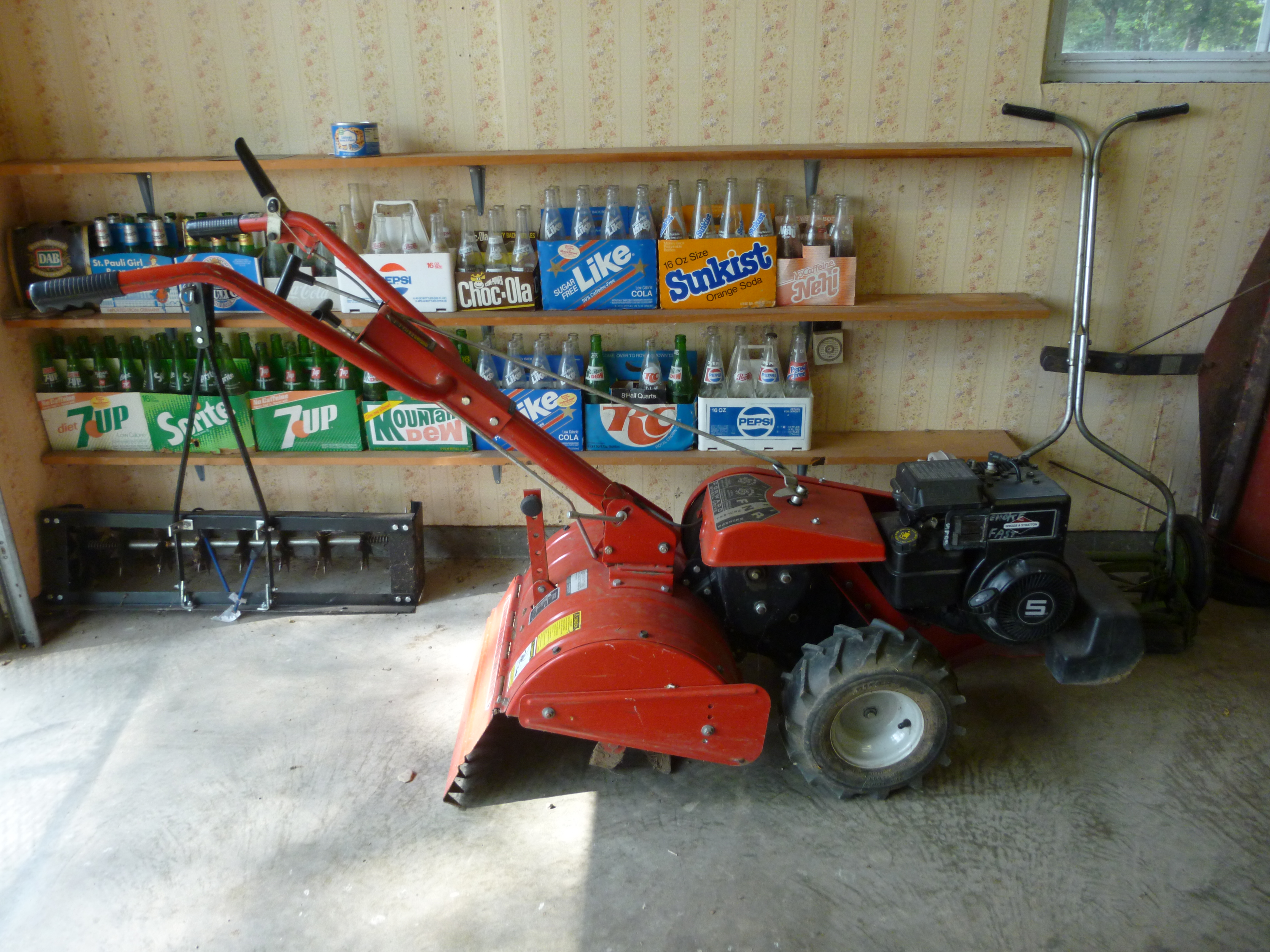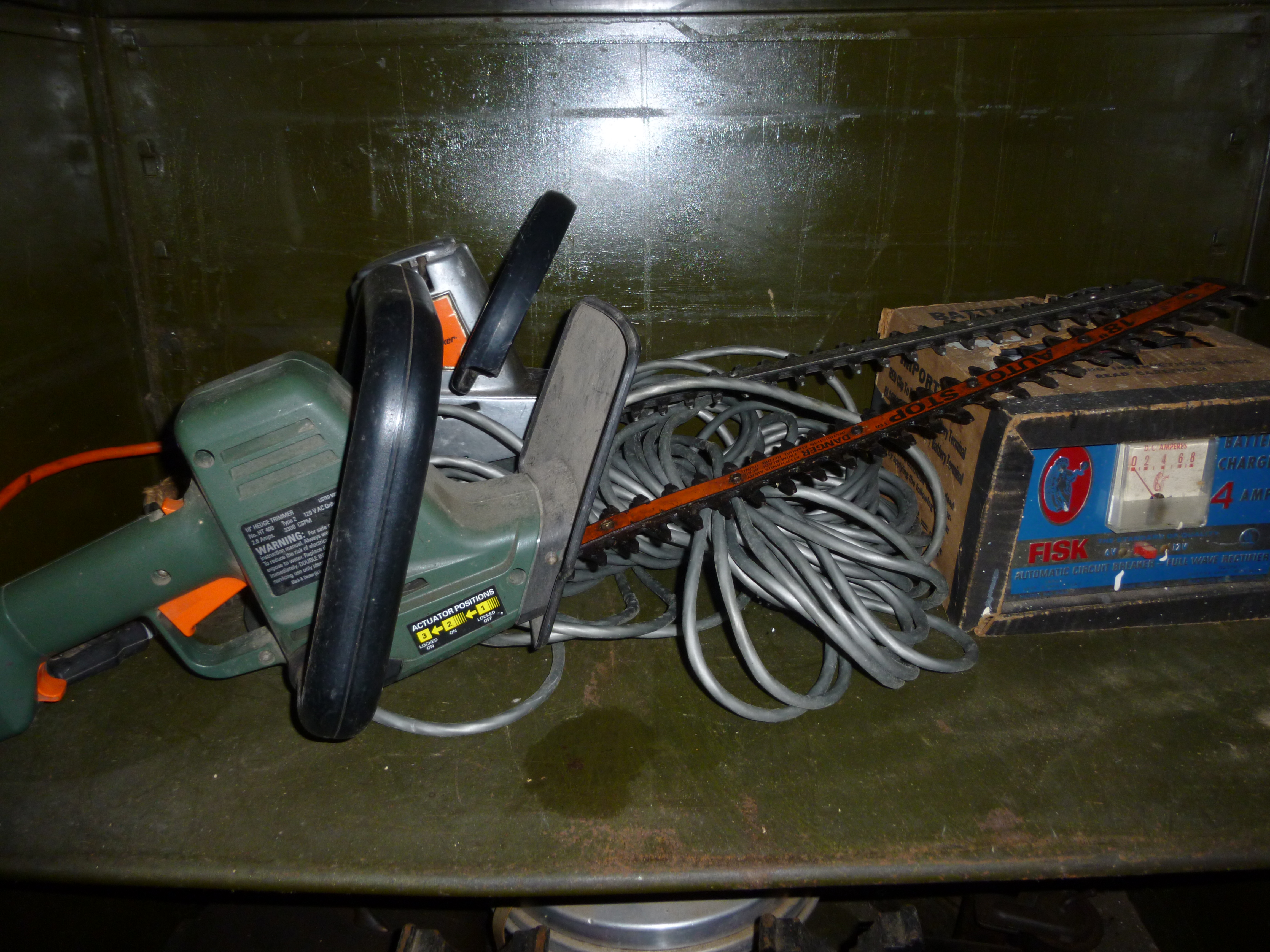 2 Schlitz ball rotating ball lights;  Schlitz beer sign; beer trays; beer bottle collection; 20 ft. alum. ladder; 40 ft. wood ladder; pulley old hand drill; old license plates; metal cabinet; coolers; mole trap; creeper; wrenches; hand tools; small vise; large bench vise; jacks;  Fisk battery charger; Skil saw; come along; power tools; garden plow; Sears push mower;  bench grinder;  lawn chairs; 2 air guns; Red Ryder BB gun; 10W 40 oil;  wood heavy duty tool chest on rollers; level;  Tool Shop auto measure tape; Husky 18” roto tiller; 38” lawn sweeper; 38” aerator; 3 ft. wooden tool box with wire bale; metal pen fencing; model T wrenches; Stihl weed trimmer; other items.