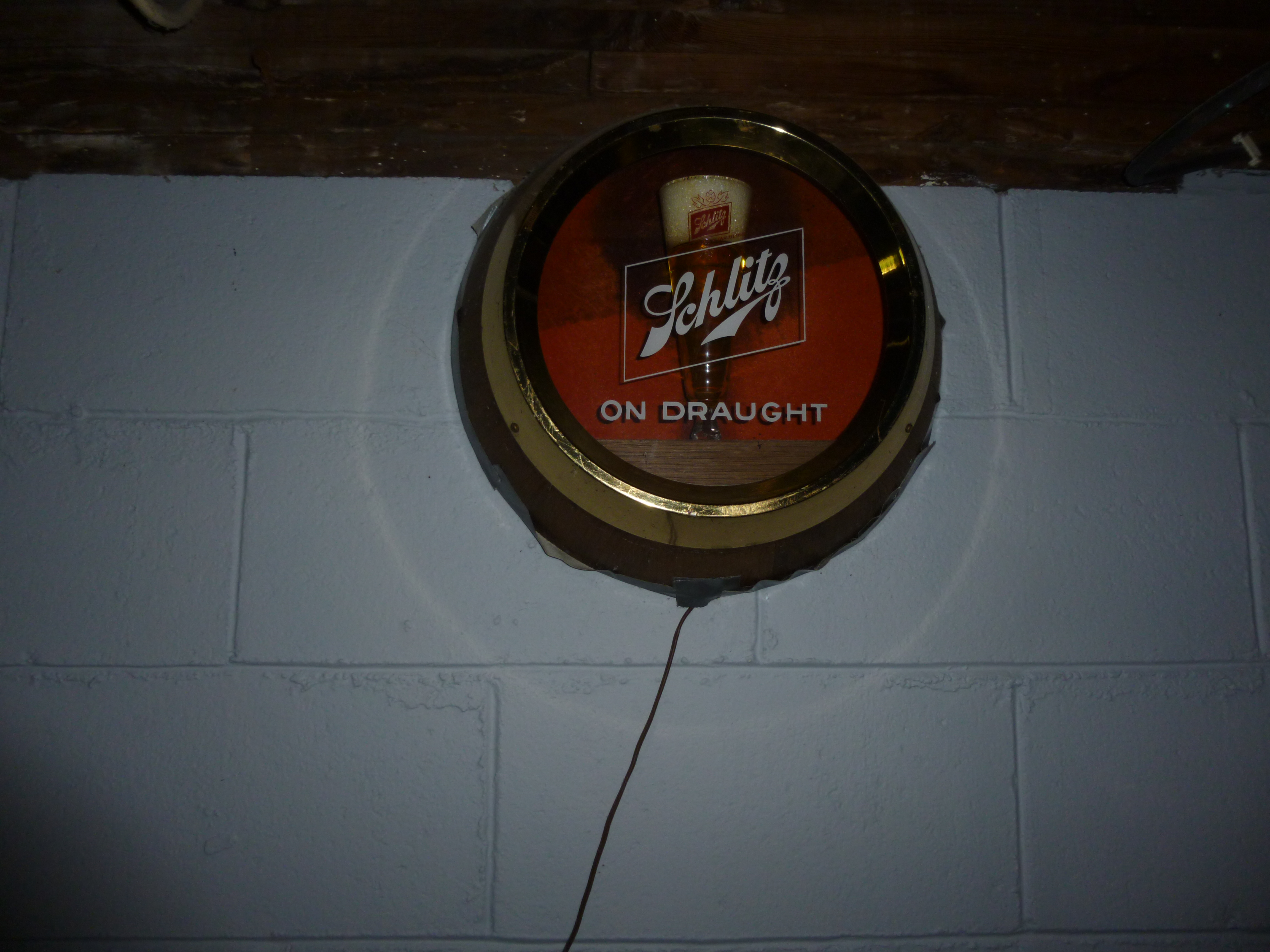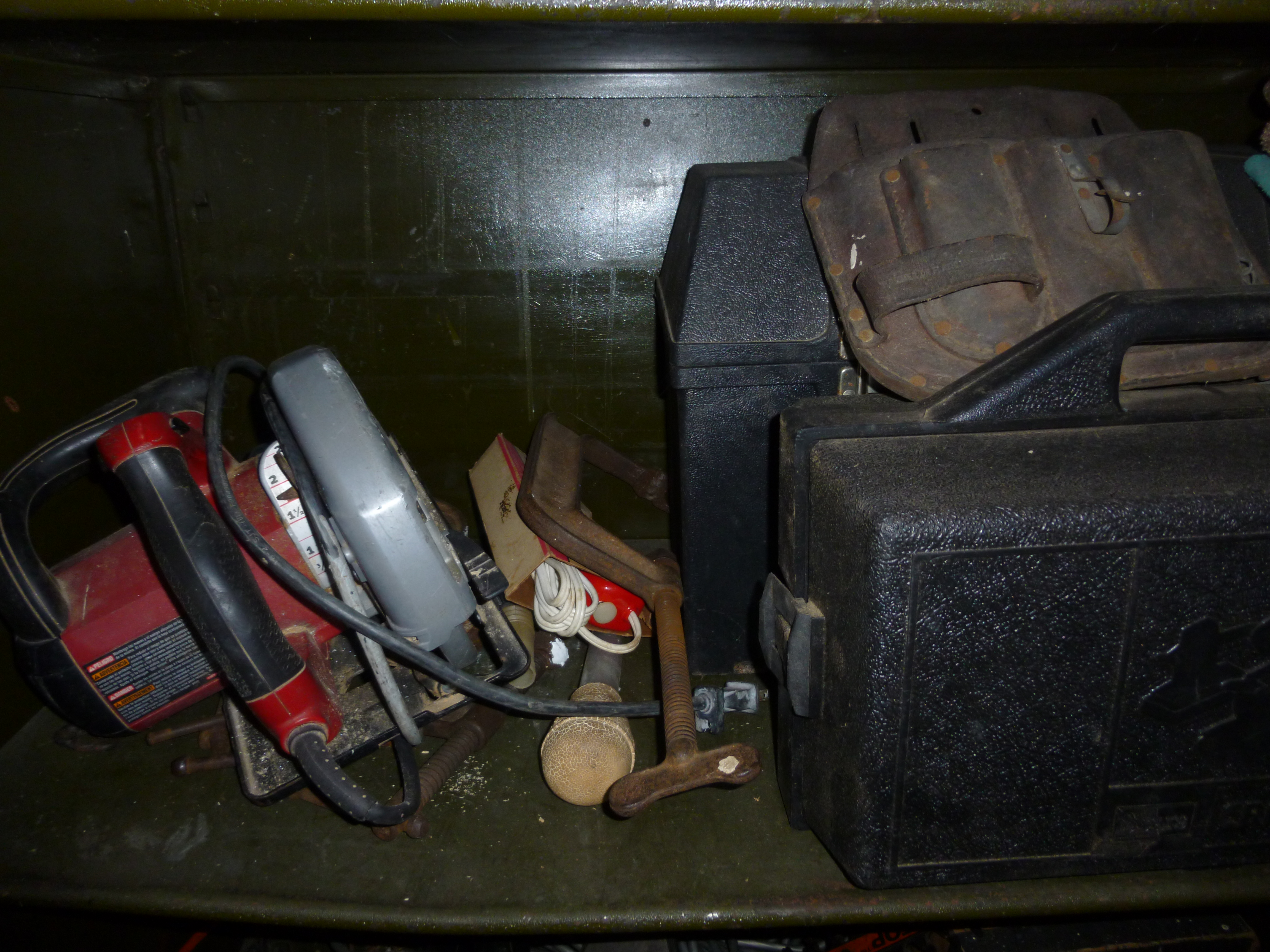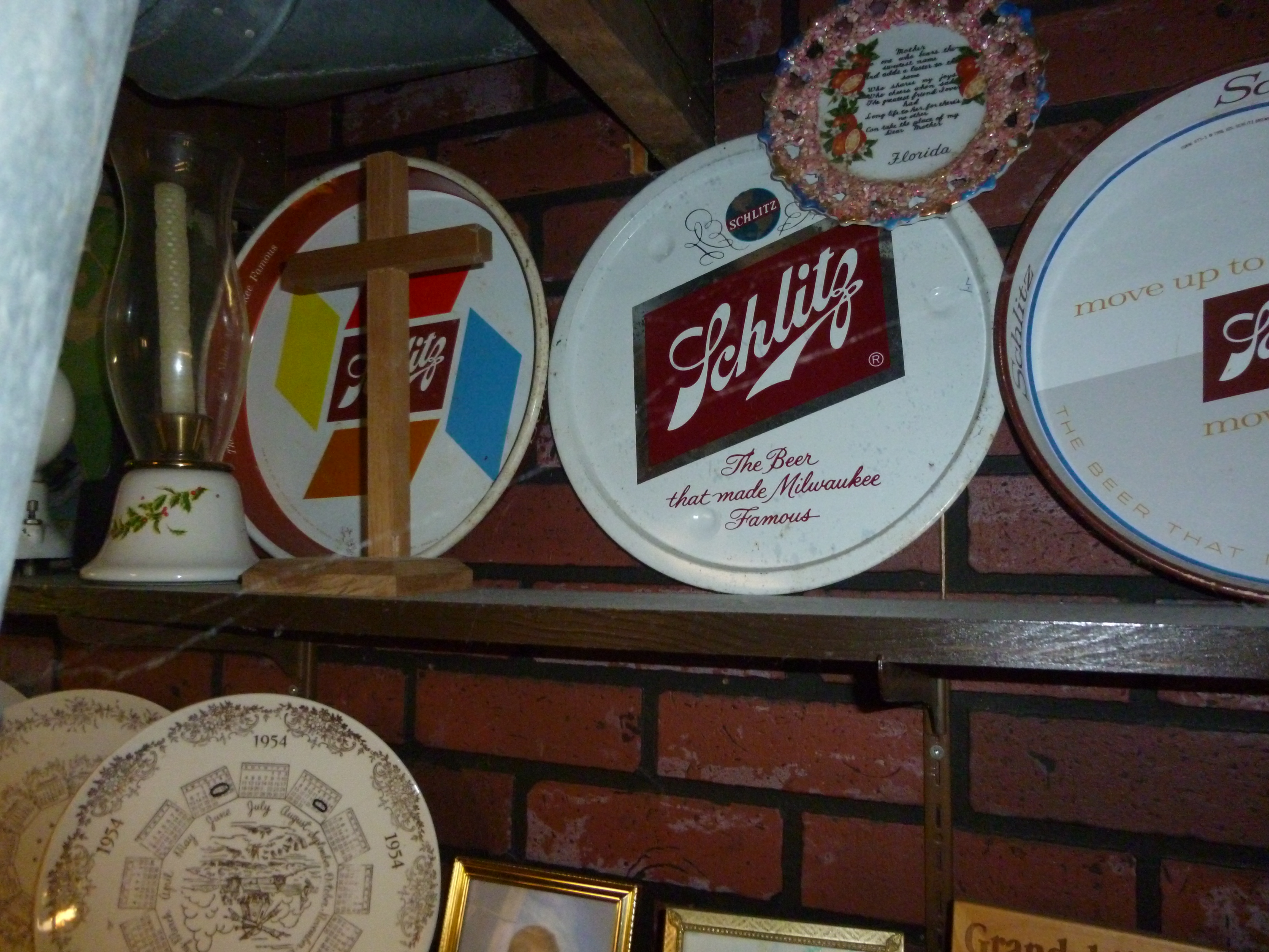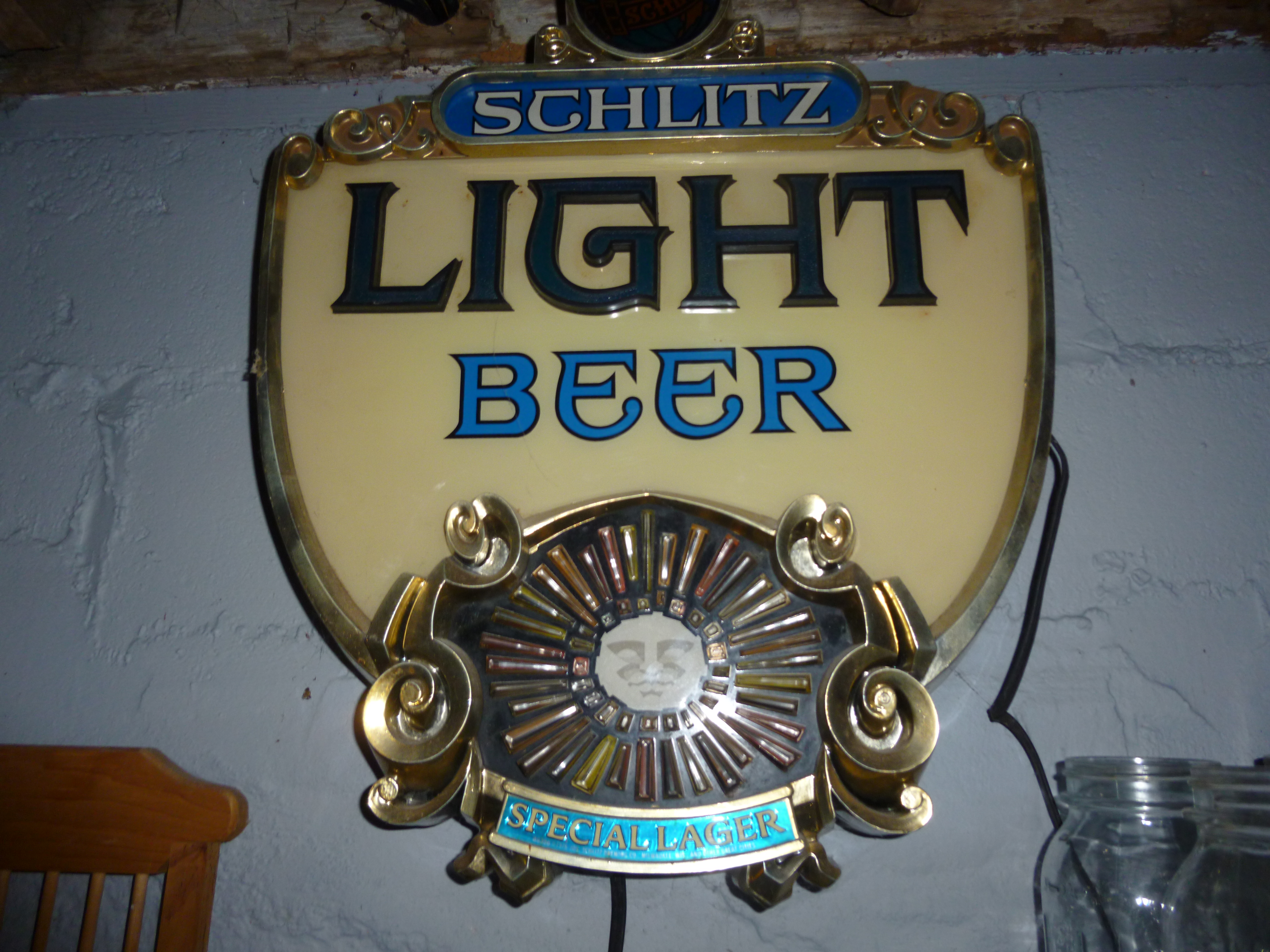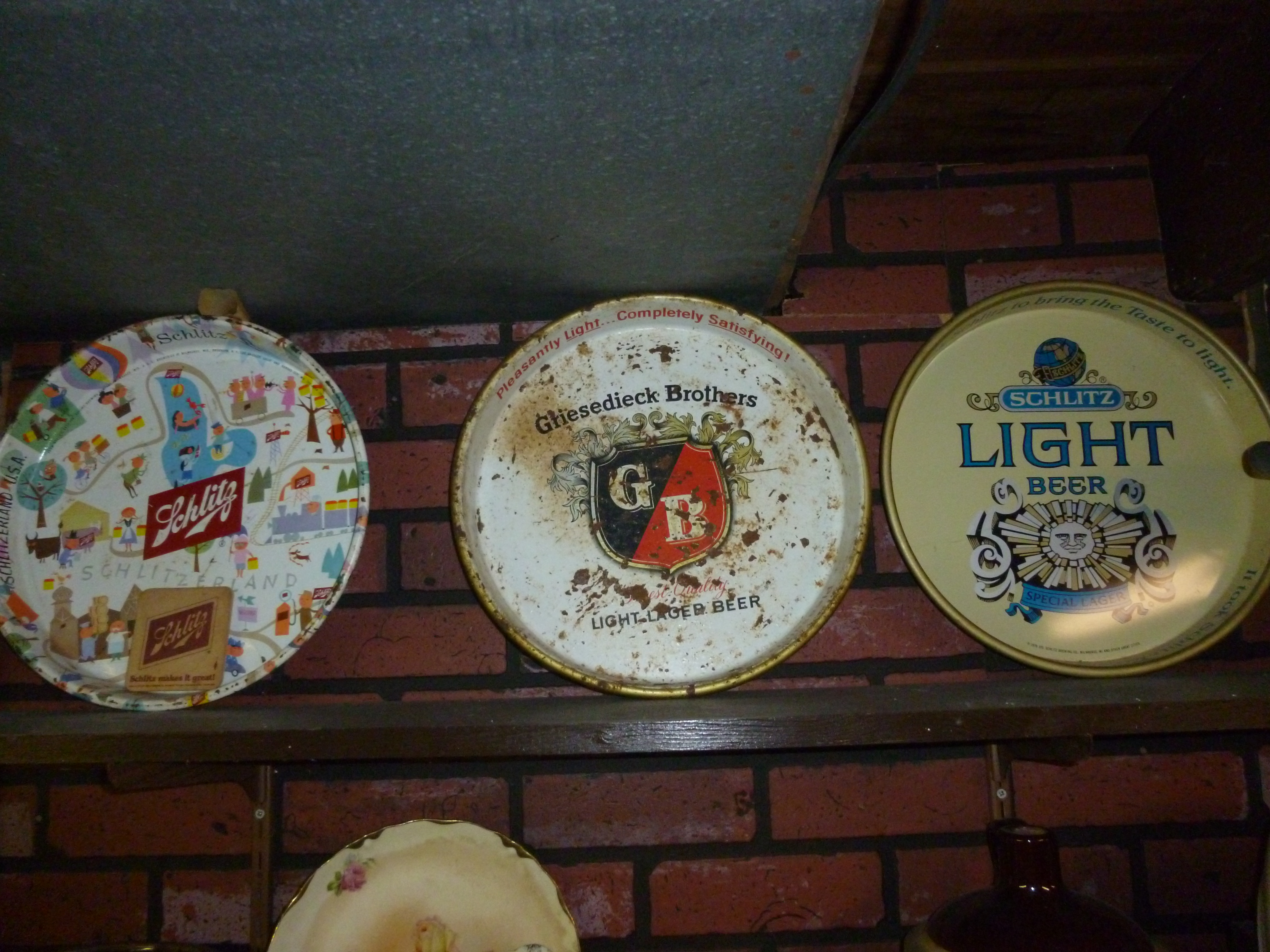 2 Schlitz ball rotating ball lights;  Schlitz beer sign; beer trays; beer bottle collection; 20 ft. alum. ladder; 40 ft. wood ladder; pulley old hand drill; old license plates; metal cabinet; coolers; mole trap; creeper; wrenches; hand tools; small vise; large bench vise; jacks;  Fisk battery charger; Skil saw; come along; power tools; garden plow; Sears push mower;  bench grinder;  lawn chairs; 2 air guns; Red Ryder BB gun; 10W 40 oil;  wood heavy duty tool chest on rollers; level;  Tool Shop auto measure tape; Husky 18” roto tiller; 38” lawn sweeper; 38” aerator; 3 ft. wooden tool box with wire bale; metal pen fencing; model T wrenches; Stihl weed trimmer; other items.