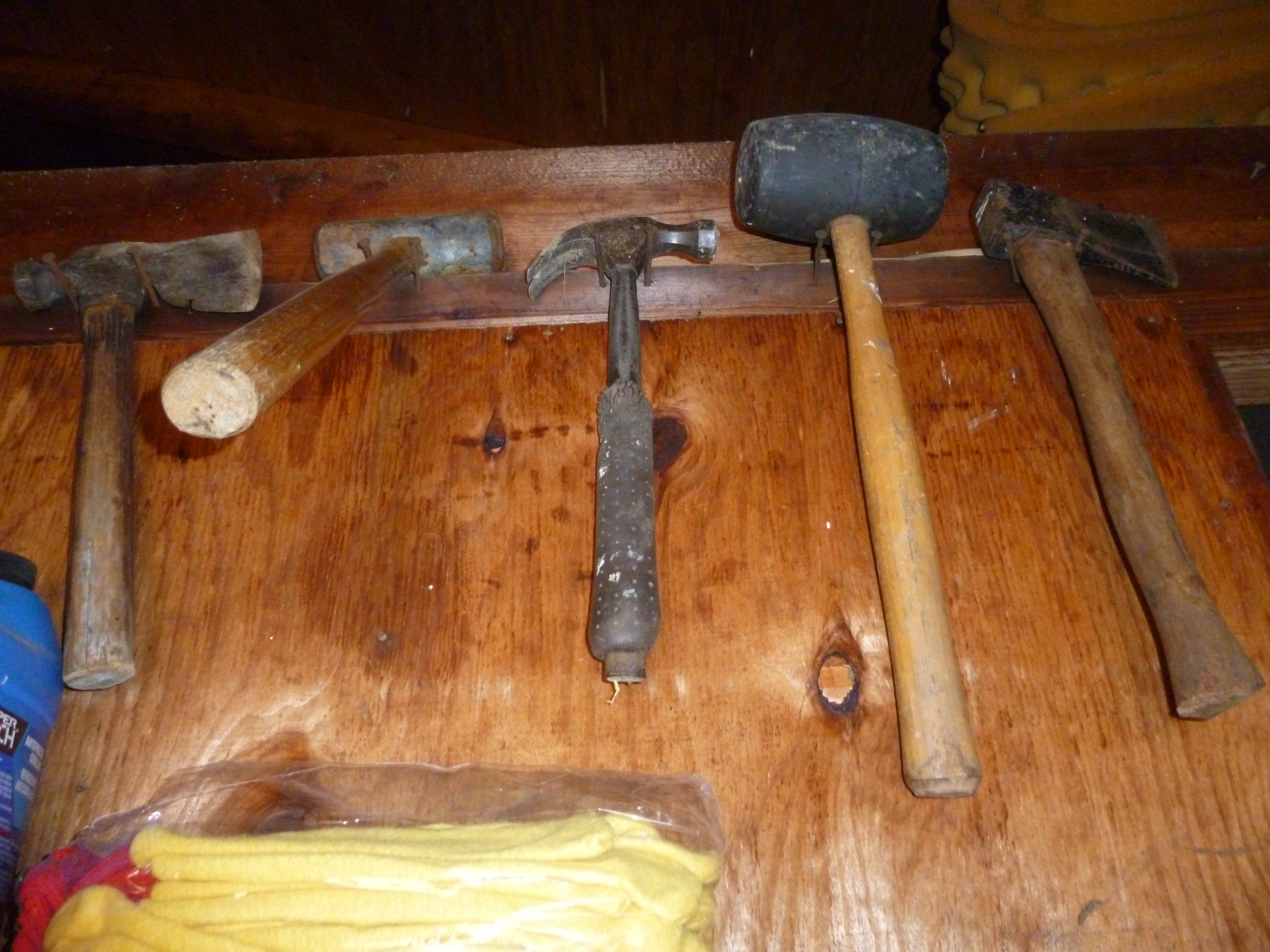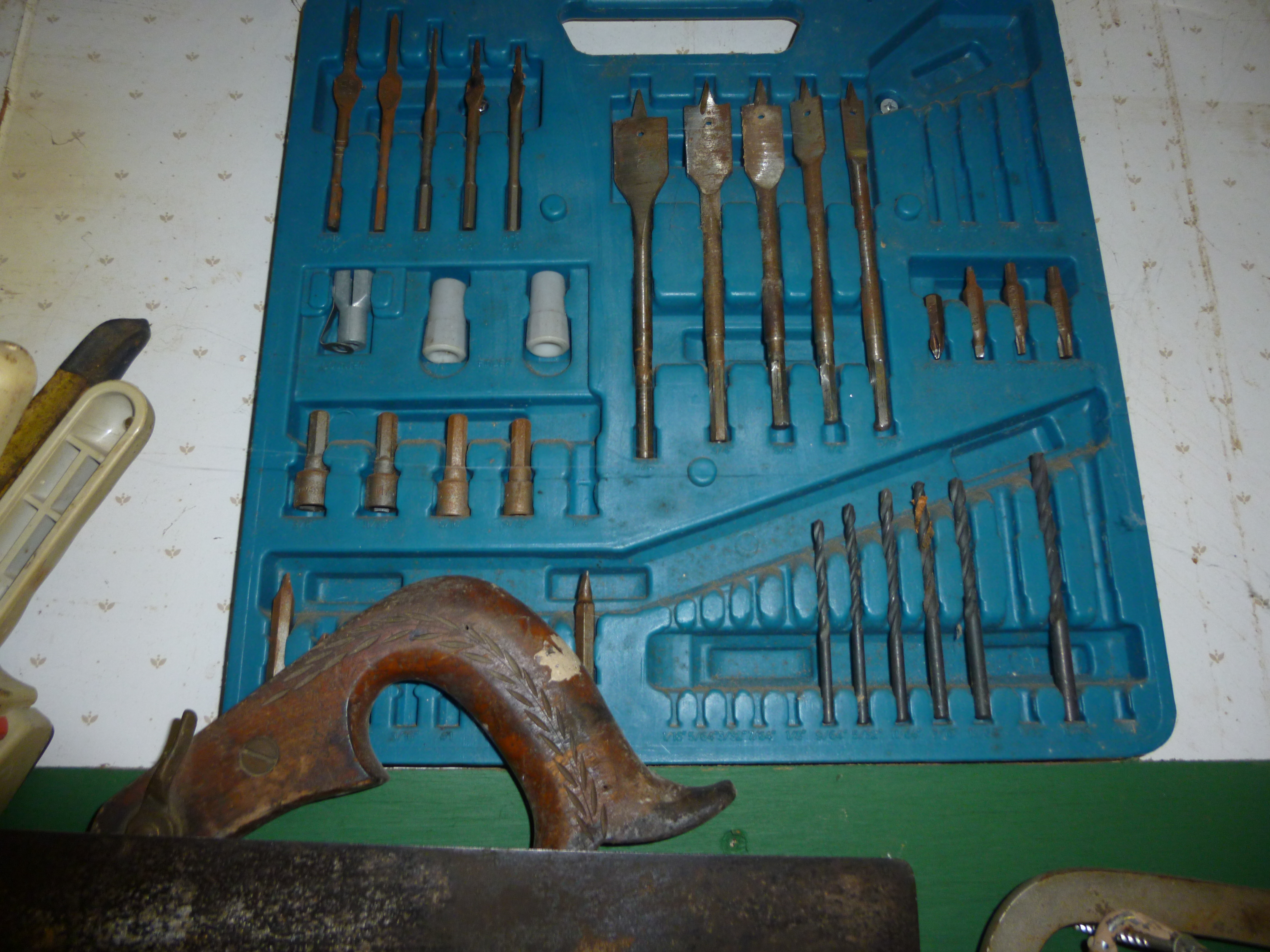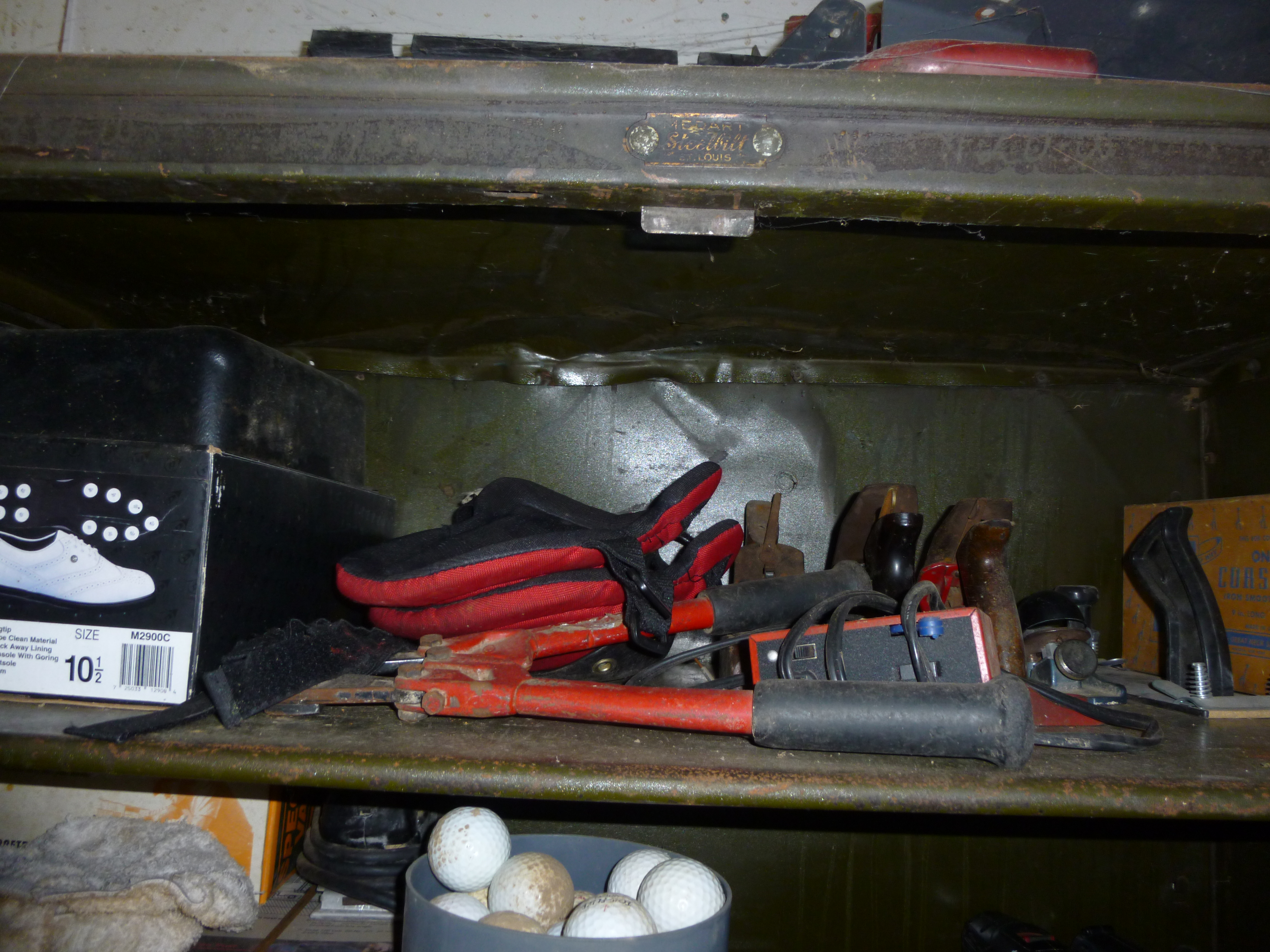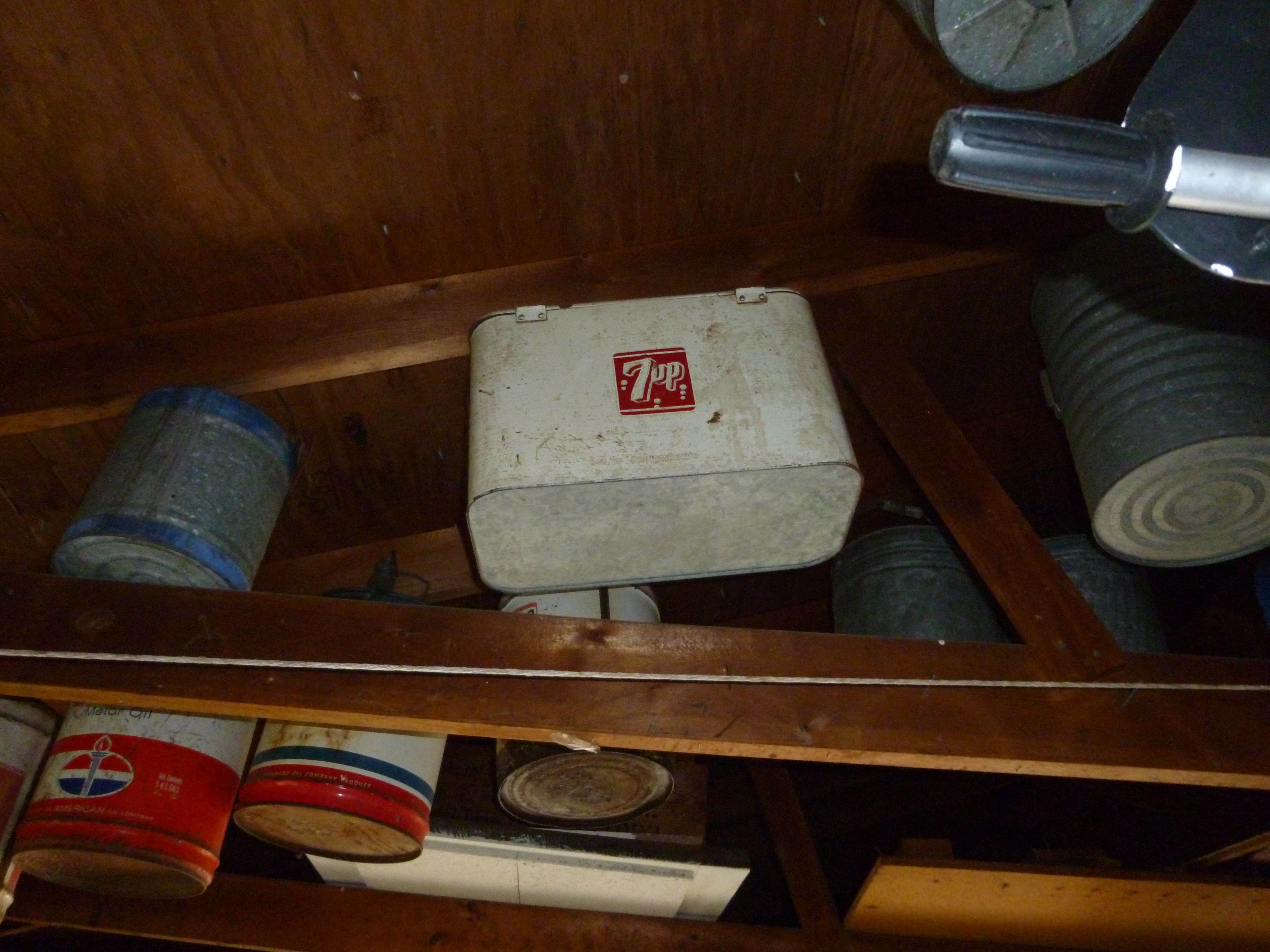 2 Schlitz ball rotating ball lights;  Schlitz beer sign; beer trays; beer bottle collection; 20 ft. alum. ladder; 40 ft. wood ladder; pulley old hand drill; old license plates; metal cabinet; coolers; mole trap; creeper; wrenches; hand tools; small vise; large bench vise; jacks;  Fisk battery charger; Skil saw; come along; power tools; garden plow; Sears push mower;  bench grinder;  lawn chairs; 2 air guns; Red Ryder BB gun; 10W 40 oil;  wood heavy duty tool chest on rollers; level;  Tool Shop auto measure tape; Husky 18” roto tiller; 38” lawn sweeper; 38” aerator; 3 ft. wooden tool box with wire bale; metal pen fencing; model T wrenches; Stihl weed trimmer; other items.