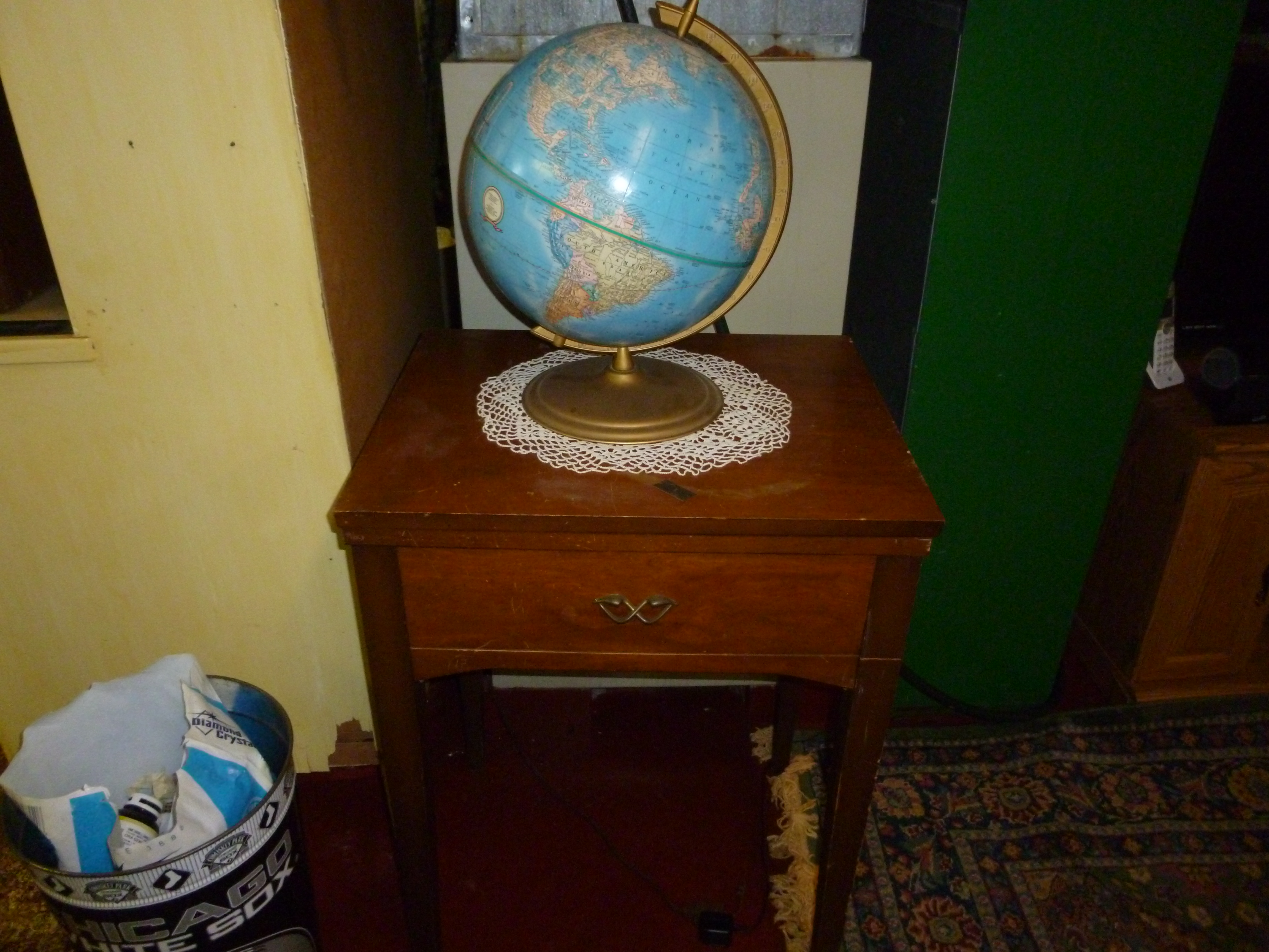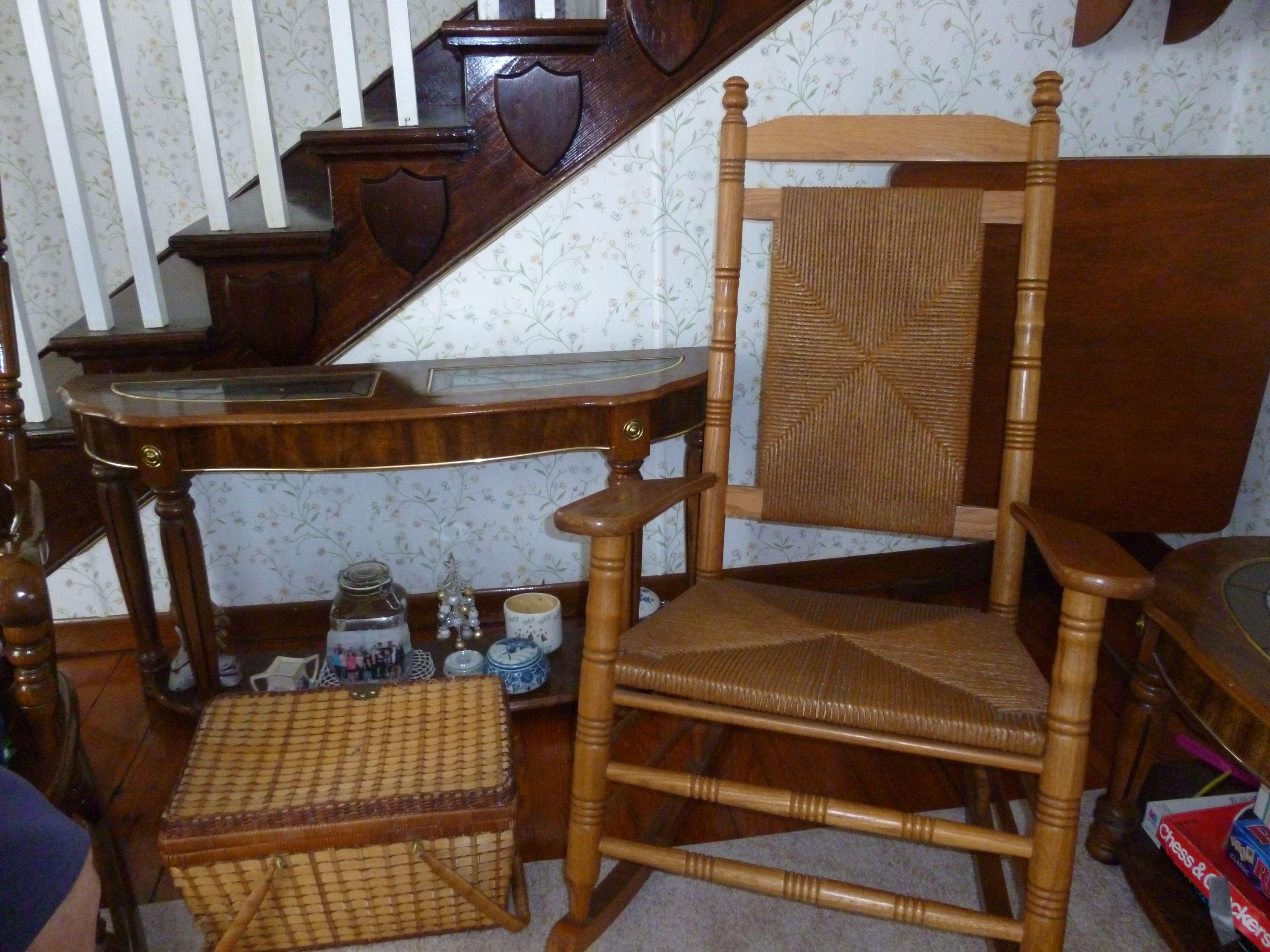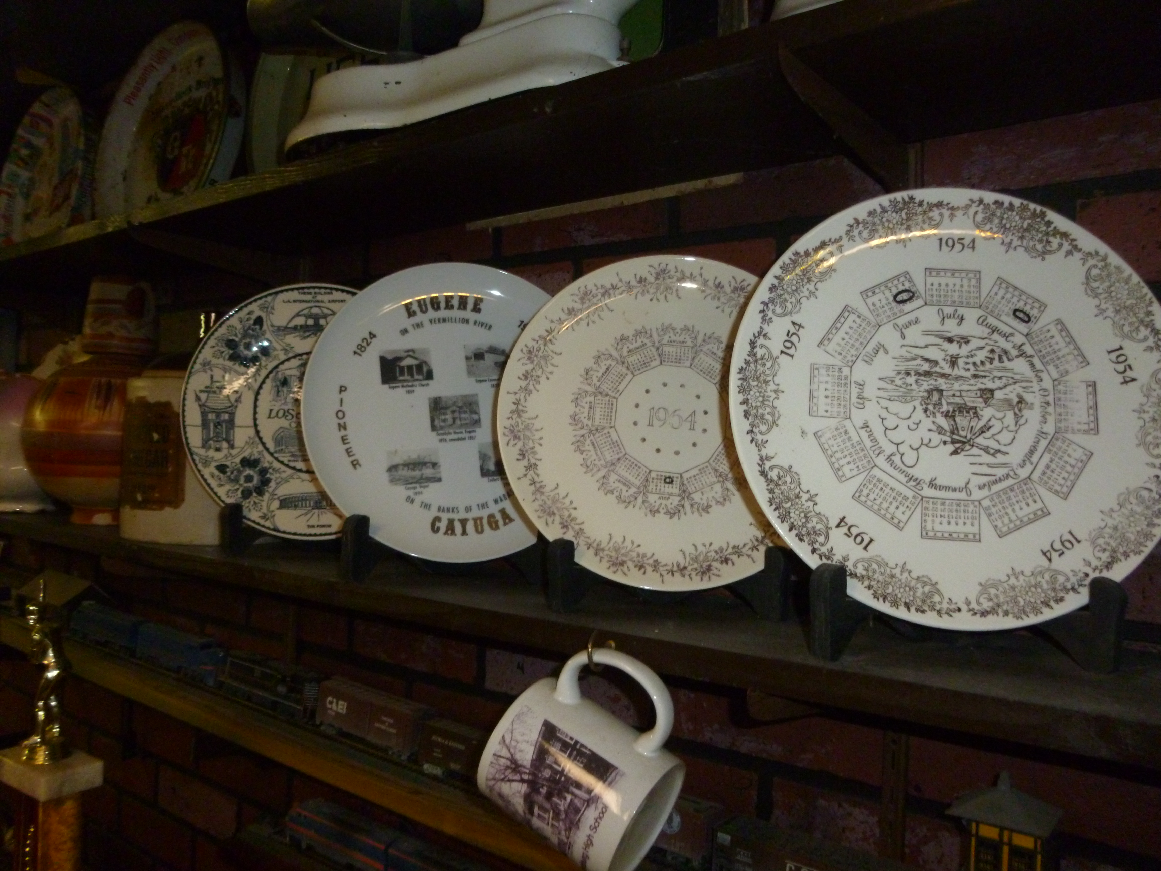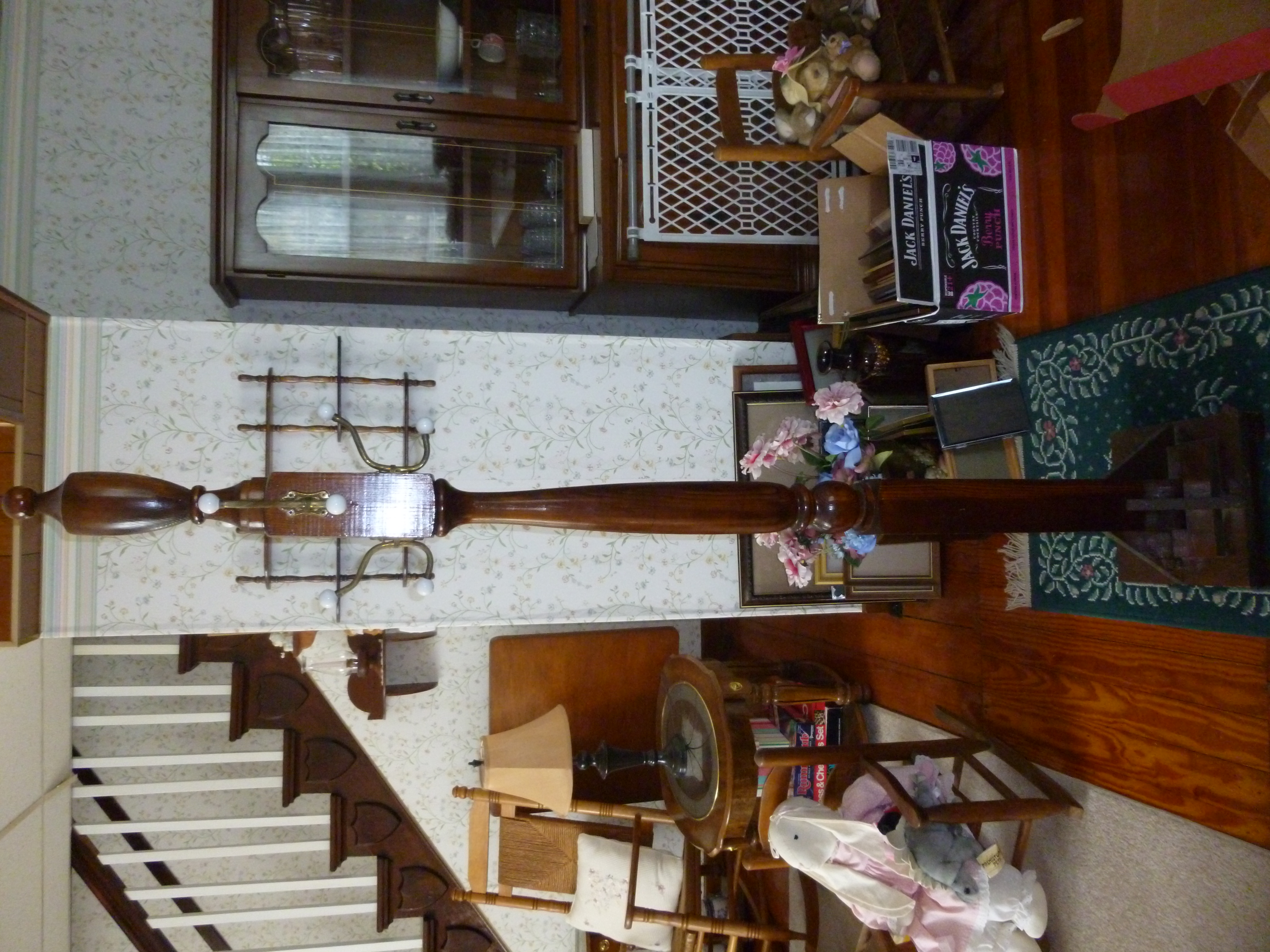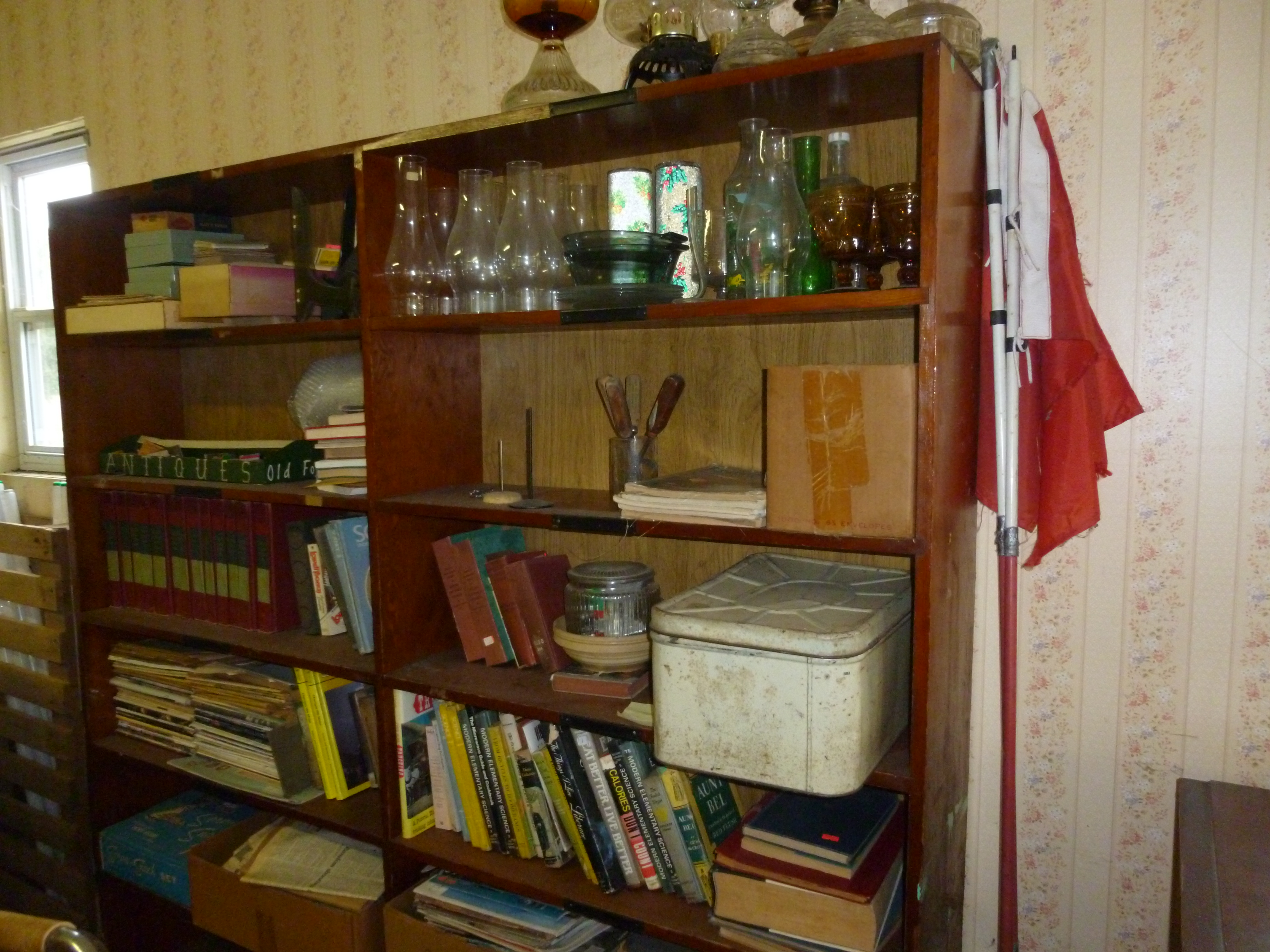 Crocks; oak rocking chair; pressed oak wood table 24” x 36” w/ carving on legs; 1940’s tilt top card table; ; oak frame bevel mirror;  old one blub floor lamp oak 14” x 14” pressed wood Queen Ann leg table; pink Victorian lamp 36” tall; oak desk chair; oak old time office chair on rollers; Gone with The Wind lamp; Roos cedar chest;  3 drawer walnut  blanket chest; 4 drawer burled wood chest; 3 drawer dresser with marble insert; small oak dresser; vintage vanity with bench; square lamp table; old portrait of girl;  4 drawer walnut chest; walnut 1950’s dining table with fluted legs; 1950’s porcelain top table with pullout leaves; white kitchen cabinet with glass doors; wooden German cabinet  6’ x 8 ‘ – 9 drawers; end tables; popcorn machine;  Clabber Girl cans; Fire King bowls; cigarette case with lights; floor lamp; small stands;  ice picks; oak school chair; 5 ft. wood sled; kerosene lamps;  7 ft. tall display lighted cabinet; 4 wooden ironing boards; Sally  Ann Bread display shelves; 2 dressers; large desk; file cabinet; WW II papers; Army blanket; Capehart TV 1953 in cabinet; 7 UP metal cooler; park bench; metal yard chairs; tricycles; bikes; JC Higgins Spring rocking Wonder horse; eagle statue; coffee mill; small oak bookcase with doors; 8 ft.  long 5 tier oak magazine rack; 5 gal. jug; Gazelle exerciser; Crams Imperial World globe; 1930’s lamps; 4 little red lanterns; 1970’s games;   7 Up glass bottles with girl – Chicago; old Coca Cola glass bottles; Old beer Fecker Brewery bottles Danville, Illinois; Illiana milk jug; Terre Haute Bottling Co. beer; JC Higgins 1940’s rifle single shot; crystal coffee grinder;   iron kettle;  6 parking meter heads; bricks from Brazil, Clinton, Wabash, Cayuga,  etc.;  2 Hummel  Goebal figurines; W C Fields statue; Fort Sill Oklahoma 1962 picture; set of 32 Harvard classics – 1910; 1912 History of U.S.; 1801 pottery milk jug with bail and lid; 2 jugs made at Veedersburg brick yard; 8’ x 10’ area rug; canner; table linens; set of Wm Rogers SP for 8 with box; sliding  glass bookcase; Kundo   clock;  white & red trim porcelain pans; iron skillets; iron favorite Dutch oven; cast iron griddle;  wooden chopping block; wood 2 shelf bookcase; old painted kitchen cupboard; cookbooks; salt crock; flour sifters; oak antique dining room server with 2 drawers; glassware – some depression; La z Boy floral sofa; oak coffee table; sofa table picture frames; Cracker Barrel wooden rocker; small wall shelf;  replica of USS Constitution; Mickey Mouse ears; collection of Autumn Leaf pattern from Jewell Tea; bell collection; foldup table; dressers; Toledo candy sealer with tray; fans; sheet music; Remo drum set – 8 pieces; 1948 Indy 500 model race car.