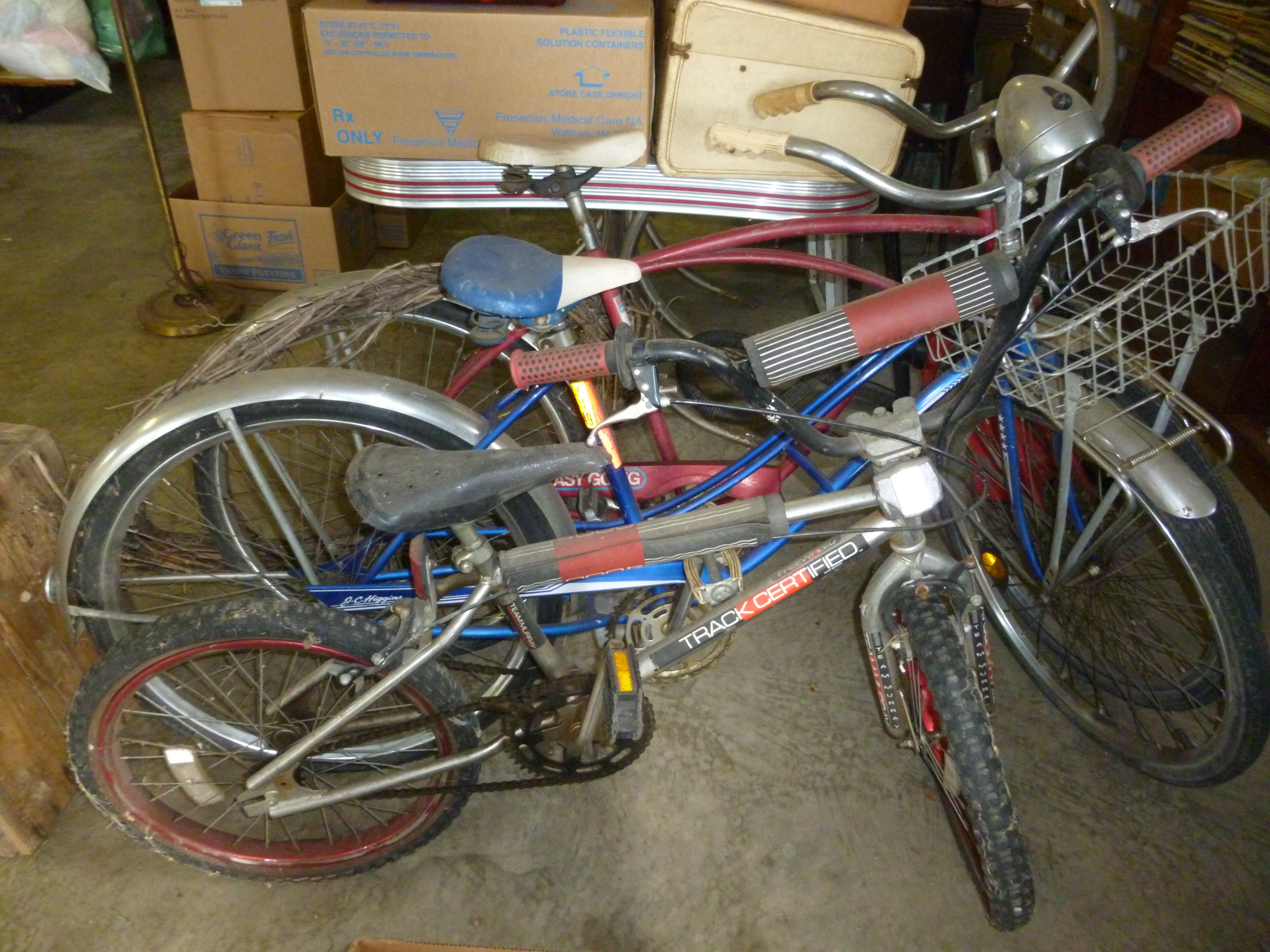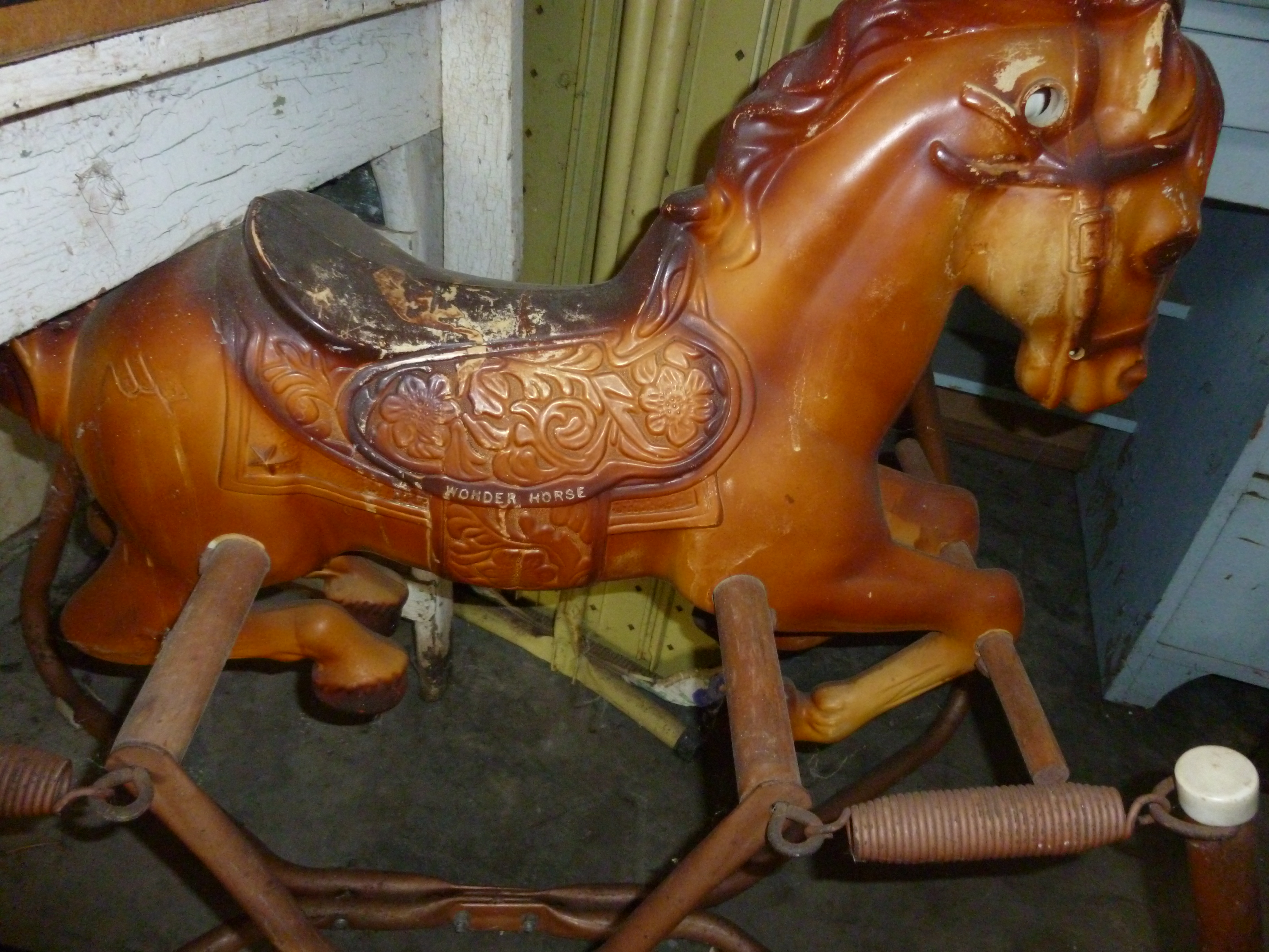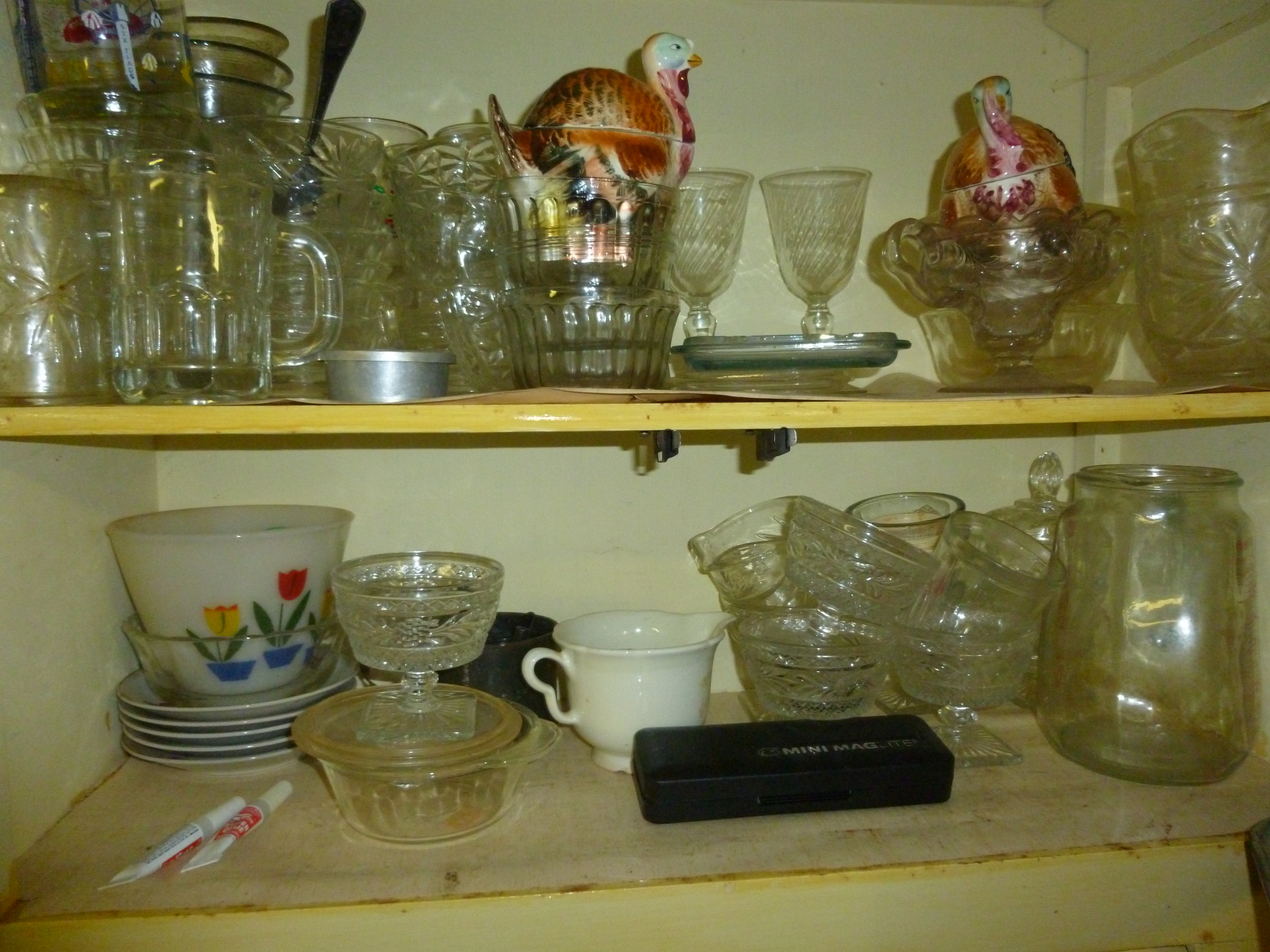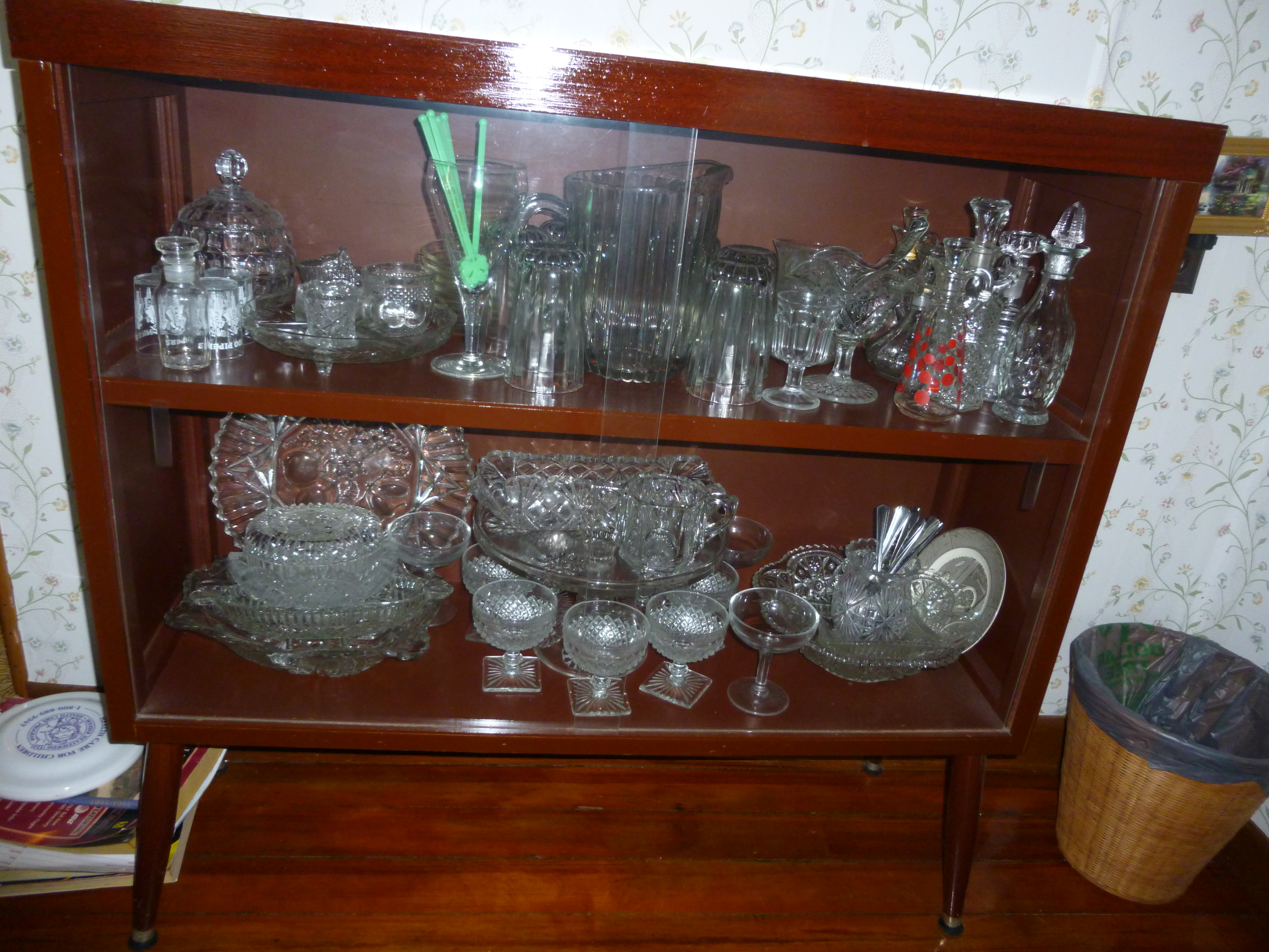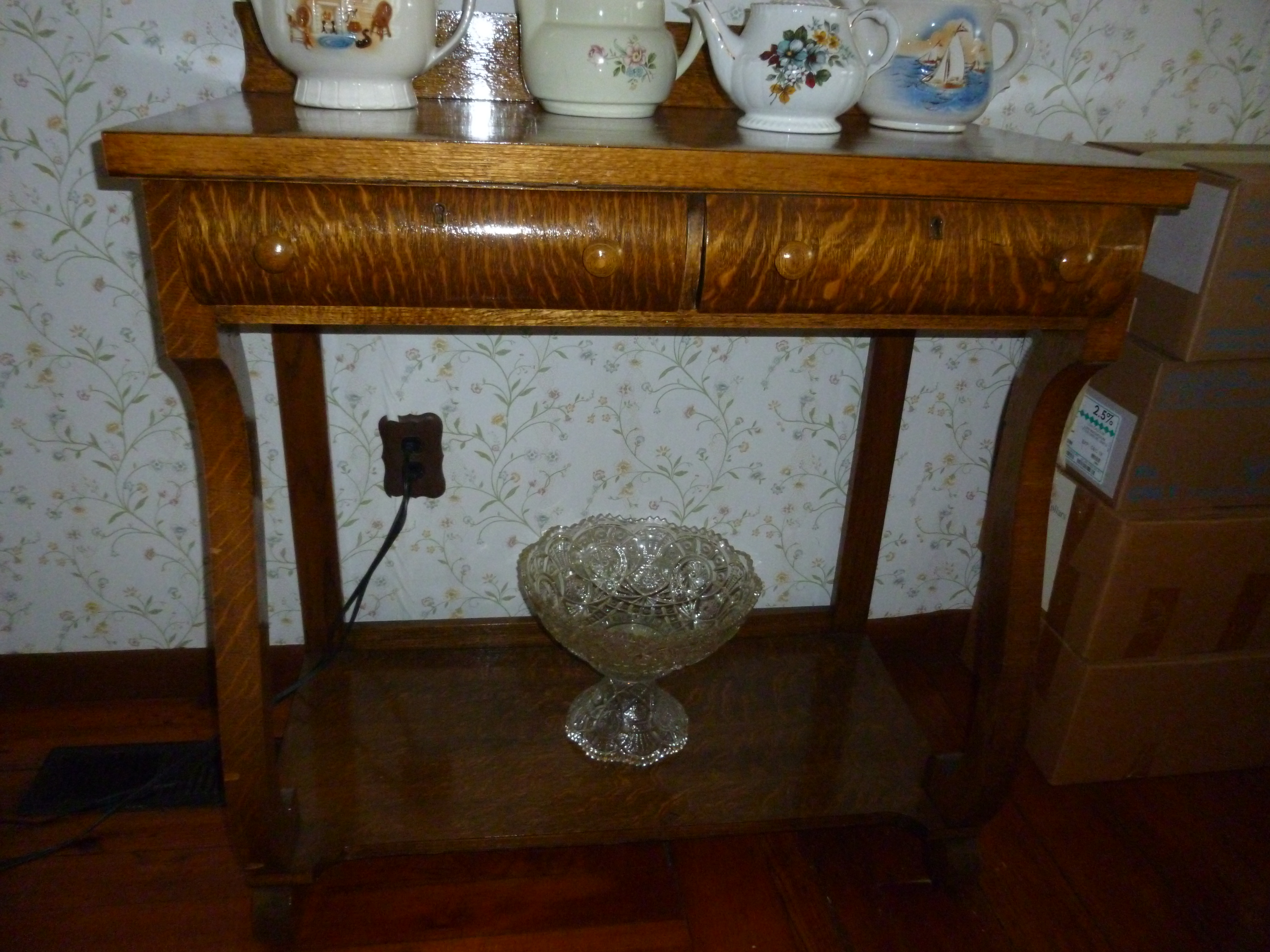 Crocks; oak rocking chair; pressed oak wood table 24” x 36” w/ carving on legs; 1940’s tilt top card table; ; oak frame bevel mirror;  old one blub floor lamp oak 14” x 14” pressed wood Queen Ann leg table; pink Victorian lamp 36” tall; oak desk chair; oak old time office chair on rollers; Gone with The Wind lamp; Roos cedar chest;  3 drawer walnut  blanket chest; 4 drawer burled wood chest; 3 drawer dresser with marble insert; small oak dresser; vintage vanity with bench; square lamp table; old portrait of girl;  4 drawer walnut chest; walnut 1950’s dining table with fluted legs; 1950’s porcelain top table with pullout leaves; white kitchen cabinet with glass doors; wooden German cabinet  6’ x 8 ‘ – 9 drawers; end tables; popcorn machine;  Clabber Girl cans; Fire King bowls; cigarette case with lights; floor lamp; small stands;  ice picks; oak school chair; 5 ft. wood sled; kerosene lamps;  7 ft. tall display lighted cabinet; 4 wooden ironing boards; Sally  Ann Bread display shelves; 2 dressers; large desk; file cabinet; WW II papers; Army blanket; Capehart TV 1953 in cabinet; 7 UP metal cooler; park bench; metal yard chairs; tricycles; bikes; JC Higgins Spring rocking Wonder horse; eagle statue; coffee mill; small oak bookcase with doors; 8 ft.  long 5 tier oak magazine rack; 5 gal. jug; Gazelle exerciser; Crams Imperial World globe; 1930’s lamps; 4 little red lanterns; 1970’s games;   7 Up glass bottles with girl – Chicago; old Coca Cola glass bottles; Old beer Fecker Brewery bottles Danville, Illinois; Illiana milk jug; Terre Haute Bottling Co. beer; JC Higgins 1940’s rifle single shot; crystal coffee grinder;   iron kettle;  6 parking meter heads; bricks from Brazil, Clinton, Wabash, Cayuga,  etc.;  2 Hummel  Goebal figurines; W C Fields statue; Fort Sill Oklahoma 1962 picture; set of 32 Harvard classics – 1910; 1912 History of U.S.; 1801 pottery milk jug with bail and lid; 2 jugs made at Veedersburg brick yard; 8’ x 10’ area rug; canner; table linens; set of Wm Rogers SP for 8 with box; sliding  glass bookcase; Kundo   clock;  white & red trim porcelain pans; iron skillets; iron favorite Dutch oven; cast iron griddle;  wooden chopping block; wood 2 shelf bookcase; old painted kitchen cupboard; cookbooks; salt crock; flour sifters; oak antique dining room server with 2 drawers; glassware – some depression; La z Boy floral sofa; oak coffee table; sofa table picture frames; Cracker Barrel wooden rocker; small wall shelf;  replica of USS Constitution; Mickey Mouse ears; collection of Autumn Leaf pattern from Jewell Tea; bell collection; foldup table; dressers; Toledo candy sealer with tray; fans; sheet music; Remo drum set – 8 pieces; 1948 Indy 500 model race car.