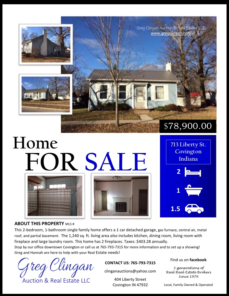 This 2-bedroom, 1-bathroom single family home offers a 1 car detached garage, gas furnace, central air, metal roof, and partial basement. The 1,240 sq. ft. living area also includes kitchen, dining room, living room with fireplace and large laundry room. This home has 2 fireplaces. Taxes: $403.28 annually. Stop by our office downtown Covington or call us at 765-793-7315 for more information and to set up a showing! Greg and Hannah are here to help with your Real Estate needs!