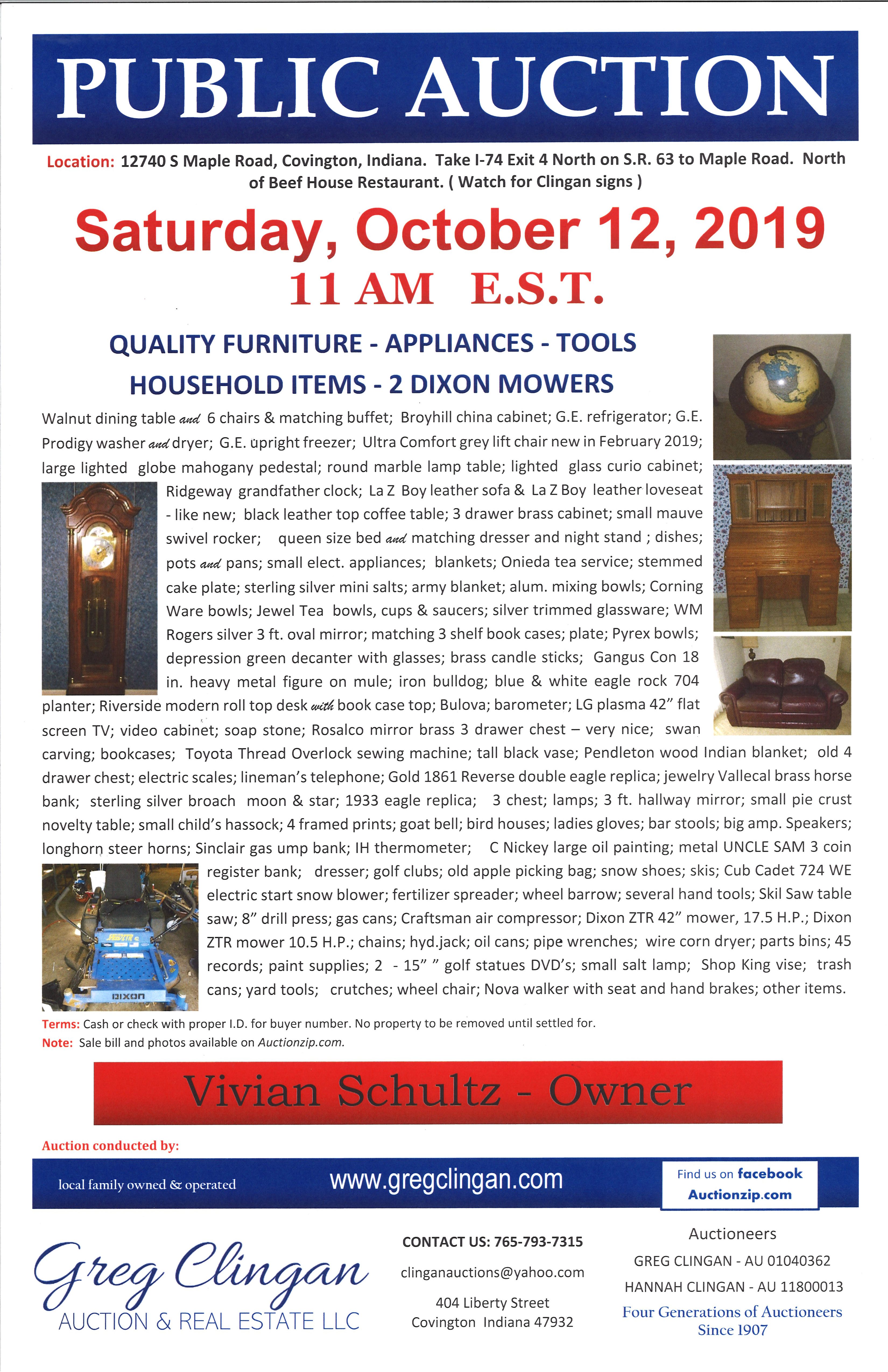 Walnut dining table and 6 chairs & matching buffet; Broyhill china cabinet; G.E. refrigerator; G.E. Prodigy washer and dryer; G.E. upright freezer; Ultra Comfort grey lift chair new in February 2019; large lighted globe mahogany pedestal; round marble lamp table; lighted glass curio cabinet; Ridgeway grandfather clock; La Z Boy leather sofa & La Z Boy leather loveseat – like new; black leather top coffee table; 3 drawer brass cabinet; small mauve swivel rocker; queen size bed and matching dresser and night stand ; dishes; pots and pans; small elect. appliances; blankets; Onieda tea service; stemmed cake plate; sterling silver mini salts; army blanket; alum. mixing bowls; Corning Ware bowls; Jewel Tea bowls, cups & saucers; silver trimmed glassware; WM Rogers silver 3 ft. oval mirror; matching 3 shelf book cases; plate; Pyrex bowls; depression green decanter with glasses; brass candle sticks; Gangus Con 18 in. heavy metal figure on mule; iron bulldog; blue & white eagle rock 704 planter; Riverside modern roll top desk with book case top; Bulova; barometer; LG plasma 42” flat screen TV; video cabinet; soap stone; Rosalco mirror brass 3 drawer chest – very nice; swan carving; bookcases; Toyota Thread Overlock sewing machine; tall black vase; Pendleton wood Indian blanket; old 4 drawer chest; electric scales; lineman’s telephone; Gold 1861 Reverse double eagle replica; jewelry Vallecal brass horse bank; sterling silver broach moon & star; 1933 eagle replica; 3 chest; lamps; 3 ft. hallway mirror; small pie crust novelty table; small child’s hassock; 4 framed prints; goat bell; bird houses; ladies gloves; bar stools; big amp. Speakers; longhorn steer horns; Sinclair gas ump bank; IH thermometer; C Nickey large oil painting; metal UNCLE SAM 3 coin register bank; dresser; golf clubs; old apple picking bag; snow shoes; skis; Cub Cadet 724 WE electric start snow blower; fertilizer spreader; wheel barrow; several hand tools; Skil Saw table saw; 8” drill press; gas cans; Craftsman air compressor; Dixon ZTR 42” mower, 17.5 H.P.; Dixon ZTR mower 10.5 H.P.; chains; hyd.jack; oil cans; pipe wrenches; wire corn dryer; parts bins; 45 records; paint supplies; 2 – 15” ” golf statues DVD’s; small salt lamp; Shop King vise; trash cans; yard tools; crutches; wheel chair; Nova walker with seat and hand brakes; other items.