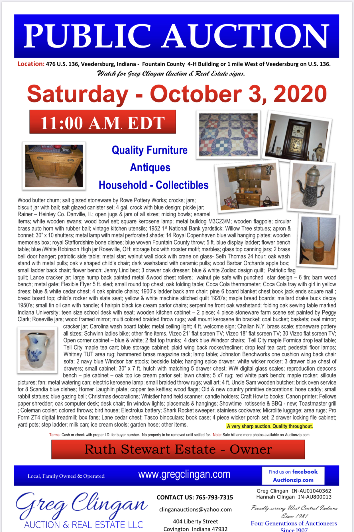Wood butter churn; salt glazed stoneware by Rowe Pottery Works; crocks; jars; biscuit jar with bail; salt glazed canister set; 4 gal. crock with blue design; pickle jar; Rainer – Heinley Co. Danville, Il.; open jugs & jars of all sizes; mixing bowls; enamel items; white wooden swans; wood bowl set; square kerosene lamp; metal bulldog M3C23/M; wooden flagpole; circular brass auto horn with rubber ball; vintage kitchen utensils; 1952 1st National Bank yardstick; Willow Tree statues; apron & bonnet; 30” x 10 shutters; metal lamp with metal perforated shade; 14 Royal Copenhaven blue wall hanging plates; wooden memories box; royal Staffordshire bone dishes; blue woven Fountain County throw; 5 ft. blue display ladder; flower bench table; blue /White Robinson High jar Roseville, OH; storage box with rooster motif; marbles; glass top canning jars; 2 brass bell door hanger; patriotic side table; metal star; walnut wall clock with crane on glass- Seth Thomas 24 hour; oak wash stand with metal pulls; oak v shaped child’s chair; dark washstand with ceramic pulls; wood Barbar Orchards apple box; small ladder back chair; flower bench; Jenny Lind bed; 3 drawer oak dresser; blue & white Zodiac design quilt;  Patriotic flag quilt; Lance cracker jar; large hump back painted metal &wood chest rollers;  walnut pie safe with punched  star design – 6 tin; barn wood bench; metal gate; Flexible Flyer 5 ft. sled; small round top chest; oak folding table; Coca Cola thermometer; Coca Cola tray with girl in yellow dress; blue & white cedar chest; 4 oak spindle chairs; 1900’s ladder back arm chair; pine 6 board blanket chest book jack ends square nail ; bread board top; child’s rocker with slate seat; yellow & white machine stitched quilt 1920’s; maple bread boards; mallard drake buck decoy 1950’s; small tin oil can with handle; 4 hairpin black ice cream parlor chairs; serpentine front oak washstand; folding oak sewing table marked Indiana University; teen size school desk with seat; wooden kitchen cabinet – 2 piece; 4 piece stoneware farm scene set painted by Peggy Clark; Roseville jars; wood framed mirror; multi colored braided throw rugs; wall mount kerosene tin bracket; coal bucket; baskets; oval mirror; cracker jar; Carolina wash board table; metal ceiling light; 4 ft. welcome sign; Challan N.Y. brass scale; stoneware pottery all sizes; Schwinn ladies bike; other fine items. Vizeo 21” flat screen TV; Vizeo 18” flat screen TV; 30 Vizeo flat screen TV; Open corner cabinet – blue & white; 2 flat top trunks;  4 dark blue Windsor chairs;  Tell City maple Formica drop leaf table; Tell City maple tea cart; blue storage cabinet; plaid wing back rocker/recliner; drop leaf tea cart; pedestal floor lamps; Whitney TUT area rug; hammered brass magazine rack; lamp table; Johnston Benchworks one cushion wing back chair sofa; 2 navy blue Windsor bar stools; bedside table; hanging spice drawer; white wicker rocker; 3 drawer blue chest of drawers; small cabinet; 30” x 7 ft. hutch with matching 5 drawer chest; WW digital glass scales; reproduction deacons bench – pie cabinet – oak top ice cream parlor set; lawn chairs; 5 x7 rug; red white park bench; maple rocker; silloute pictures; fan; metal watering can; electric kerosene lamp; small braided throw rugs; wall art; 4 ft. Uncle Sam wooden butcher; brick oven service for 8 Scandia blue dishes; Homer Laughlin plate; copper tea kettles; wood flags; Old & new country primitive decorations; hose caddy; small rabbit statues; blue gazing ball; Christmas decorations; Whistler hand held scanner; candle holders; Craft How to books; Canon printer; Fellows paper shredder; oak computer desk; desk chair; tin window lights; placemats & hangings; Showtime  rotisserie & BBQ – new; Toastmaster grill ; Coleman cooler; colored throws; bird house; Electrolux battery; Shark Rocket sweeper; stainless cookware; Microlite luggage; area rugs; Pro Form ZT4 digital treadmill; box fans; Lane cedar chest; Tasco binoculars; book case; 4 piece wicker porch set; 2 drawer locking file cabinet; yard pots; step ladder; milk can; ice cream stools; garden hose; other items.